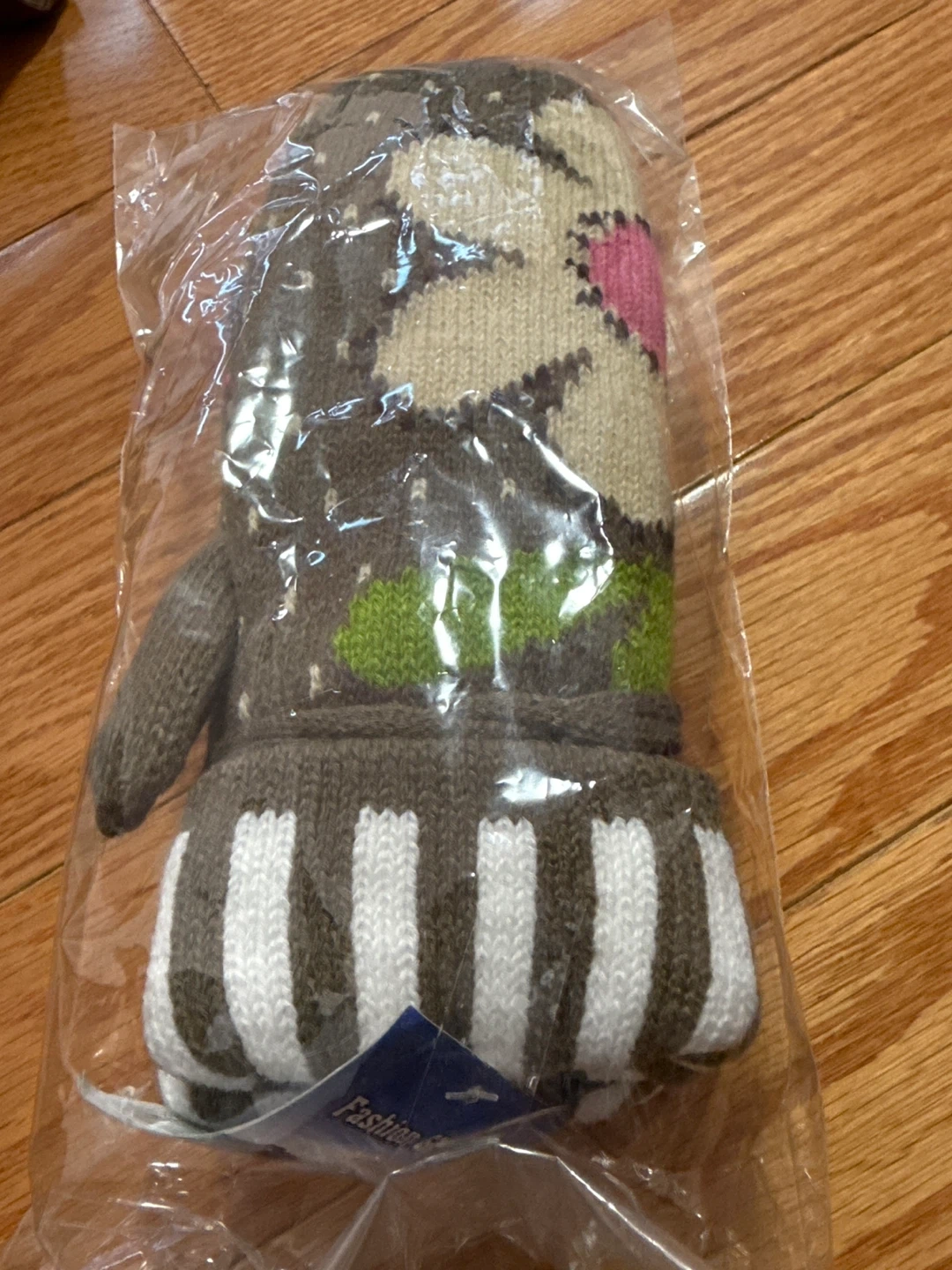 🧡These cozy knitted mittens feature a charming animal design with brown, cream, green, and pink accents. They're brand new and still in their original packaging. Perfect for keeping your hands warm on chilly days!🧡