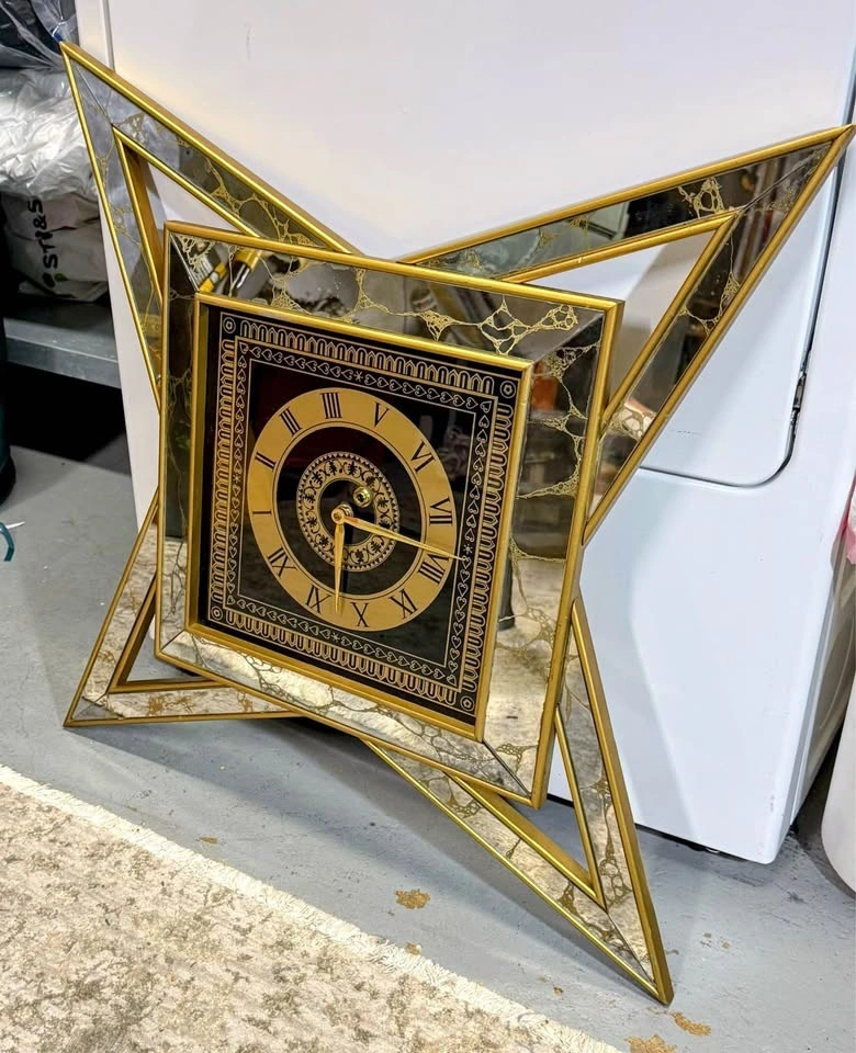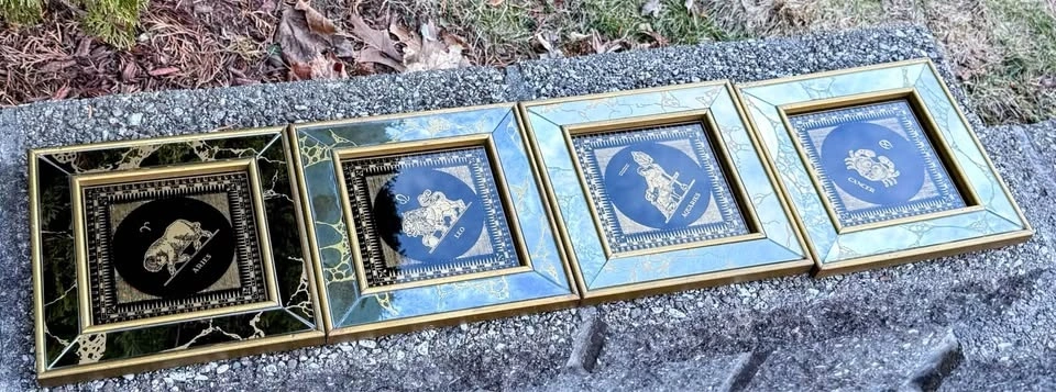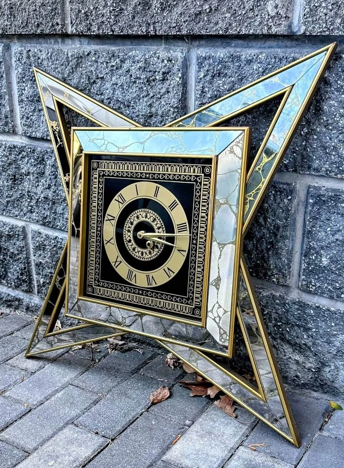 Original Turner Mfg. Co. wall clock with the classic mid-century starburst design. Gold and mirrored glass construction with Roman numeral face — strong presence and looks excellent on the wall. Authentic Turner Wall Accessory. Circa 1950s–early 1960s. Original Turner winding key included. Fully working. Glass in good condition — no cracks. Minor wear and tear consistent with age. Well-made vintage piece and getting harder to find complete and working. Also comes with Four Zodiac signs & Key.Local Pickup only,Yonkers 10704