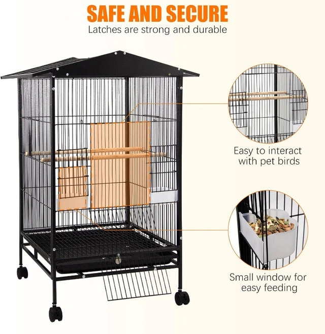This large bird cage is made of high-quality, low-carbon, rust-proof and waterproof steel, with guaranteed quality and durability. Covered with non-toxic hammer-pattern paint, giving birds a healthier and safer living environment. The steel frame is stable, with four caster wheels at the bottom, so you can move it anywhere you like, saving you effort. The cage sits on four heavy duty rolling casters that can roll in all directions smoothly. A slide-out tray covered with waterproof paint can be removed and cleaned with water, making cleaning a breeze. A grate between birds and the tray can avoid your pets walking directly on their droppings, which ensures both your pets’ hygiene and the tidiness of the cage. Steel wires are evenly spaced to ensure safety and meet ornamental value at the same time. Simple assembly is required to set up this bird cage. The cage comes with all necessary hardware and detailed instructions for easy and quick assembly. Located in Summerside, SE London. Message to arrange PICK UP ONLY.