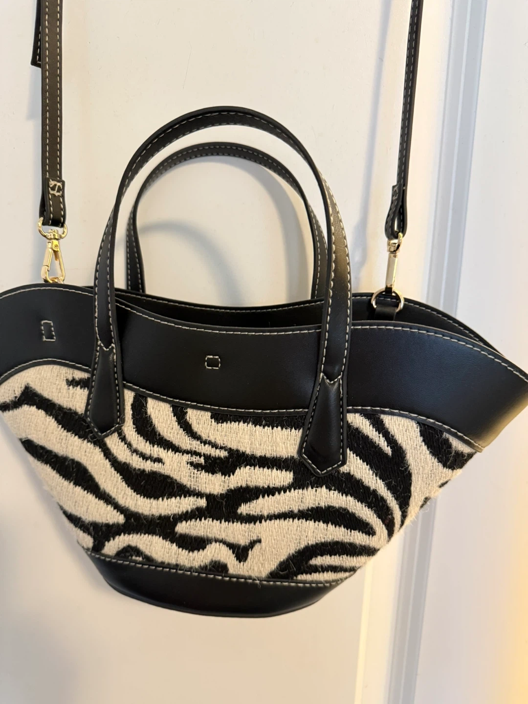 Stylish H&M tote bag with a black and white zebra print panel. It's made from faux leather with contrast stitching and has top handles and a removable shoulder strap. Inside, there's a small pocket.