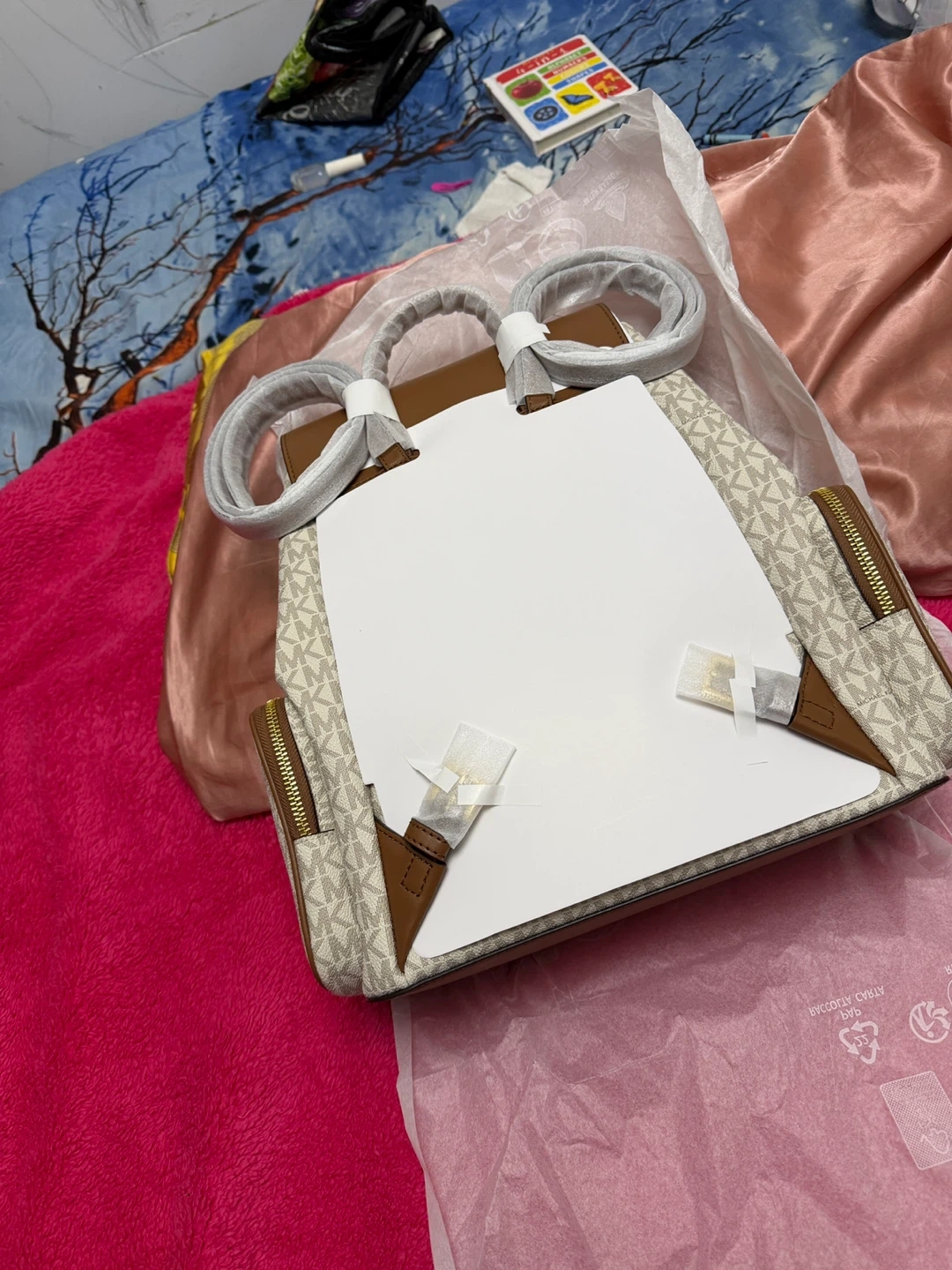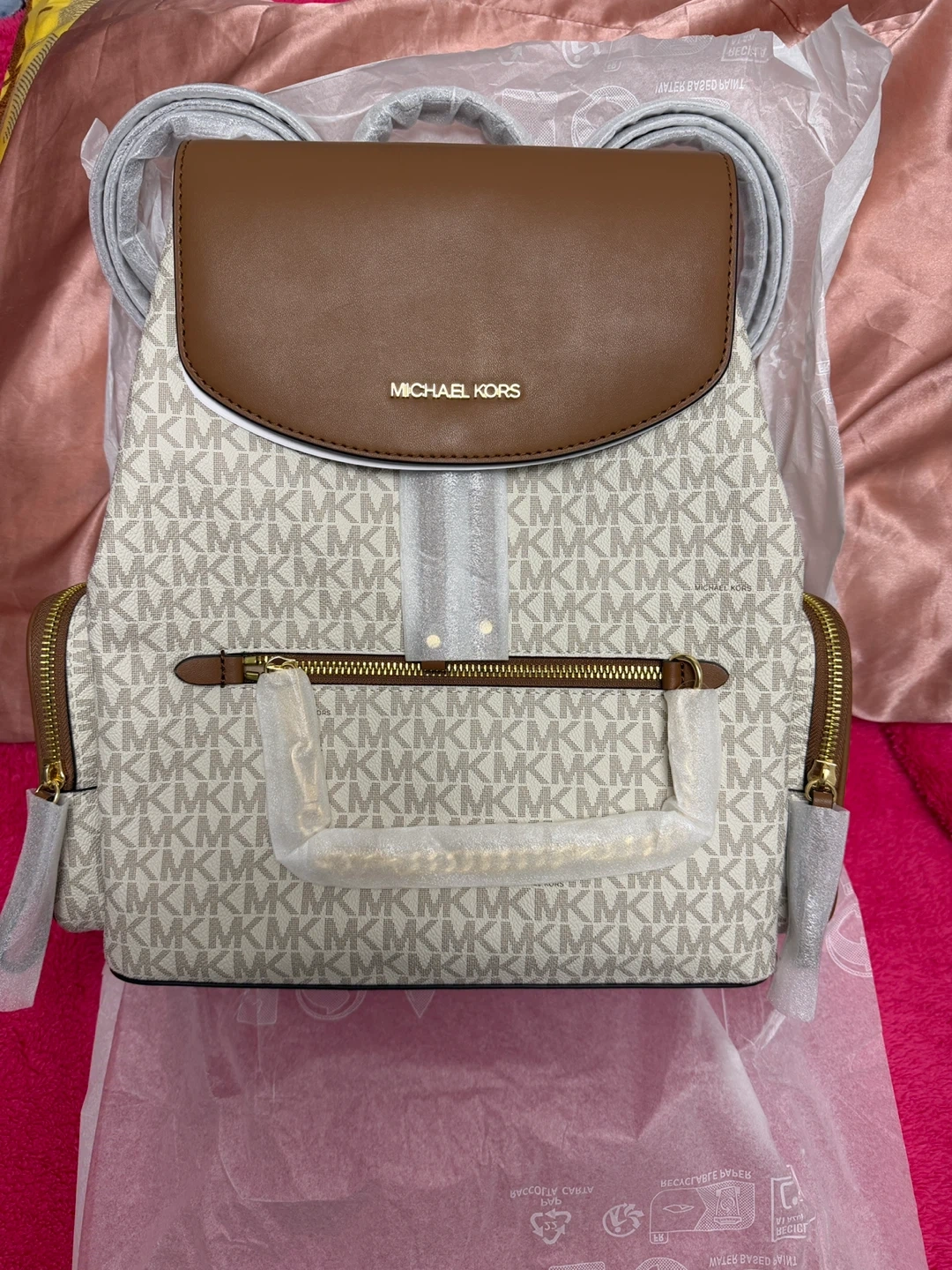 Brand new Michael Kors backpack. It's the signature MK pattern with brown leather accents and gold hardware. Features a front zip pocket and side zip pockets.