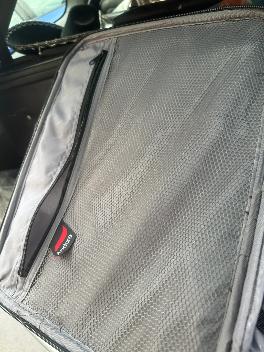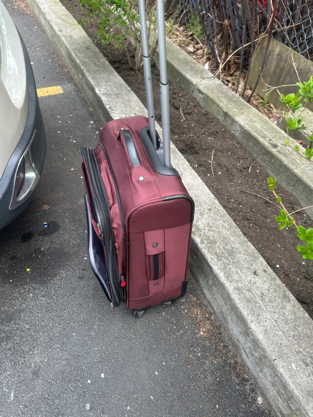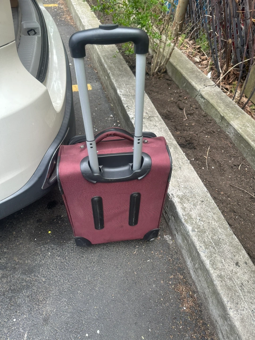 This rolling suitcase comes in a deep maroon color. It features a retractable handle and wheels for easy transport. Interior has a zippered mesh pocket.