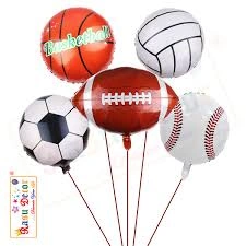 Five foil sport ball balloons. Includes basketball, volleyball, football, soccer ball, and baseball. Great for parties or decorations.