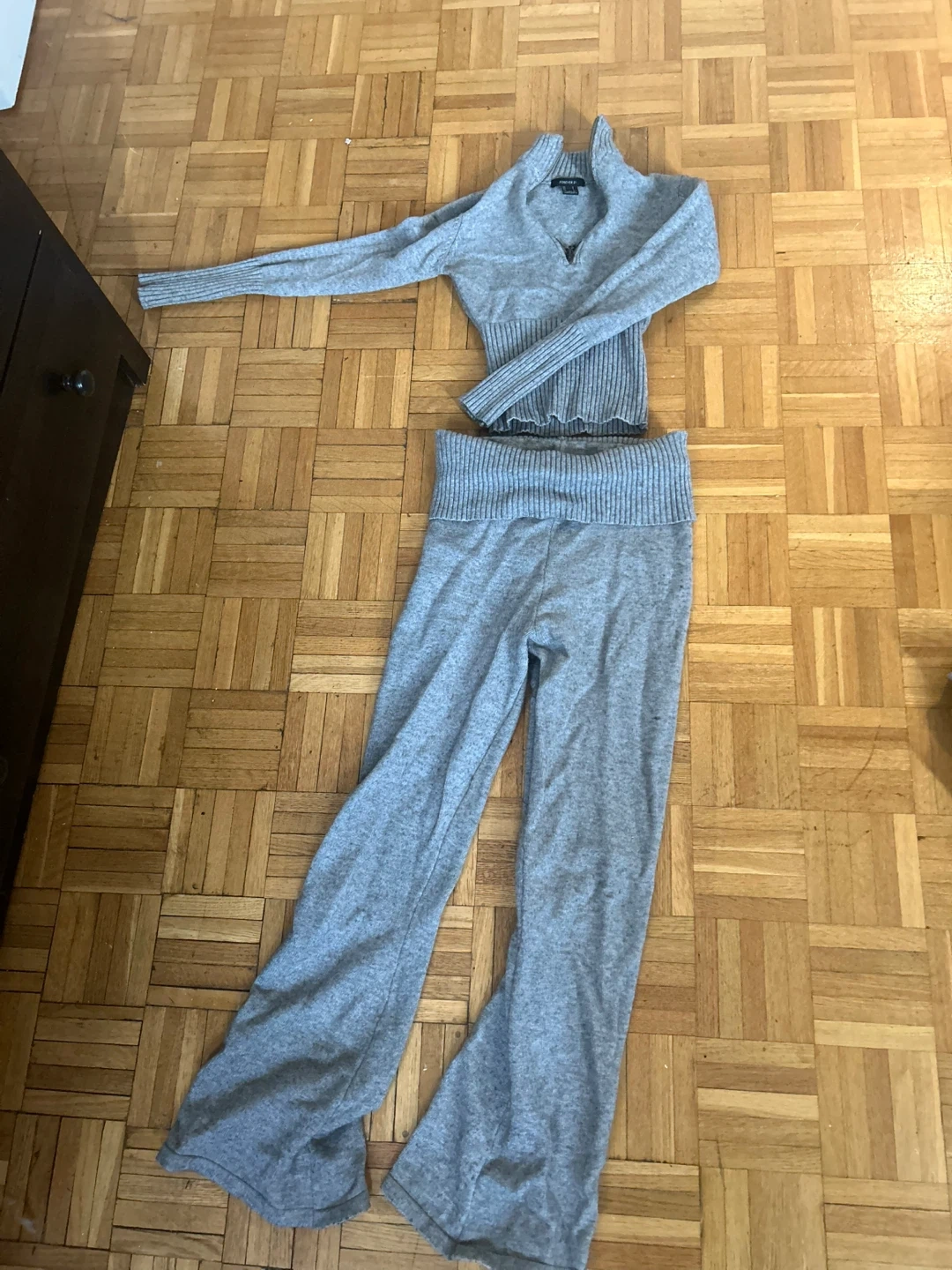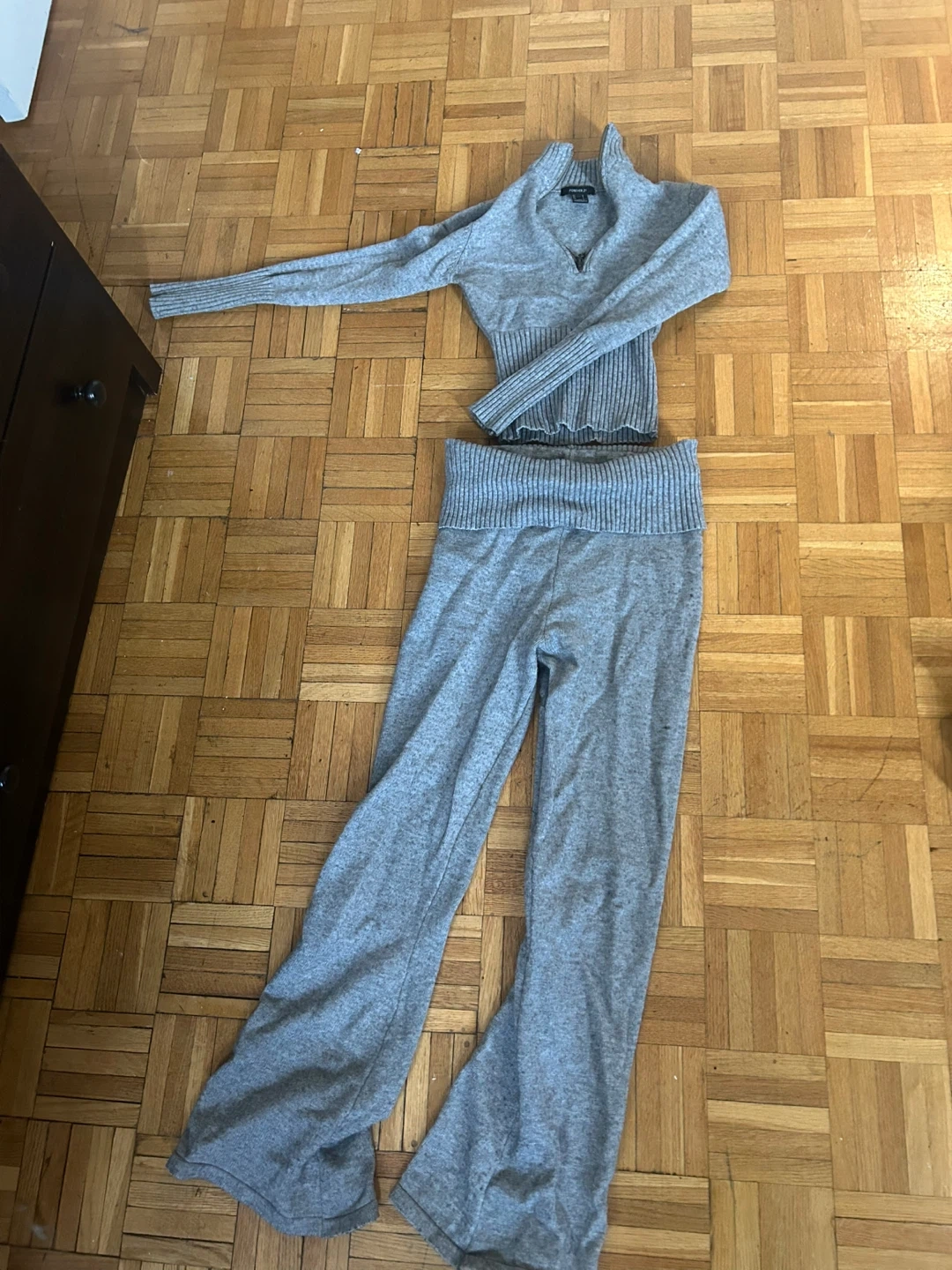 This is a grey sweater and pants set from Forever 21. The sweater has a quarter-zip neckline and ribbed detailing. The pants have a high waistband and flared legs. It's made of a soft knit material.