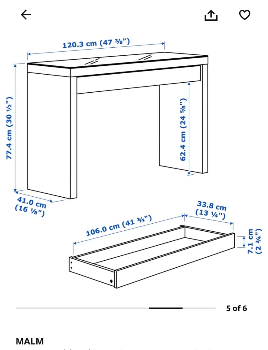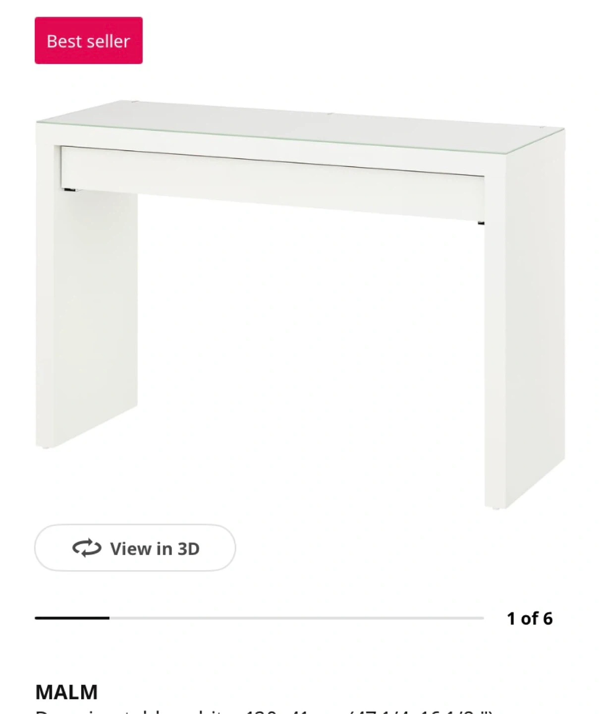 This IKEA MALM console table features a sleek white finish and a durable glass top. It has one spacious drawer, perfect for storing essentials. The dimensions are 120.3 cm (47 5/8") wide, 41.0 cm (16 1/8") deep, and 77.4 cm (30 1/2") high. Its clean design makes it a versatile piece for any room.