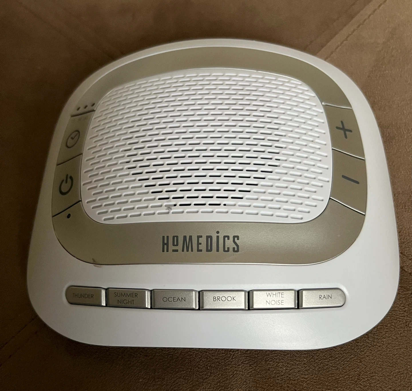 HoMedics sound machine with multiple sound options. Features Thunder, Summer Night, Ocean, Brook, White Noise, and Rain sounds. Includes timer function and volume controls. It's great for creating a relaxing atmosphere.