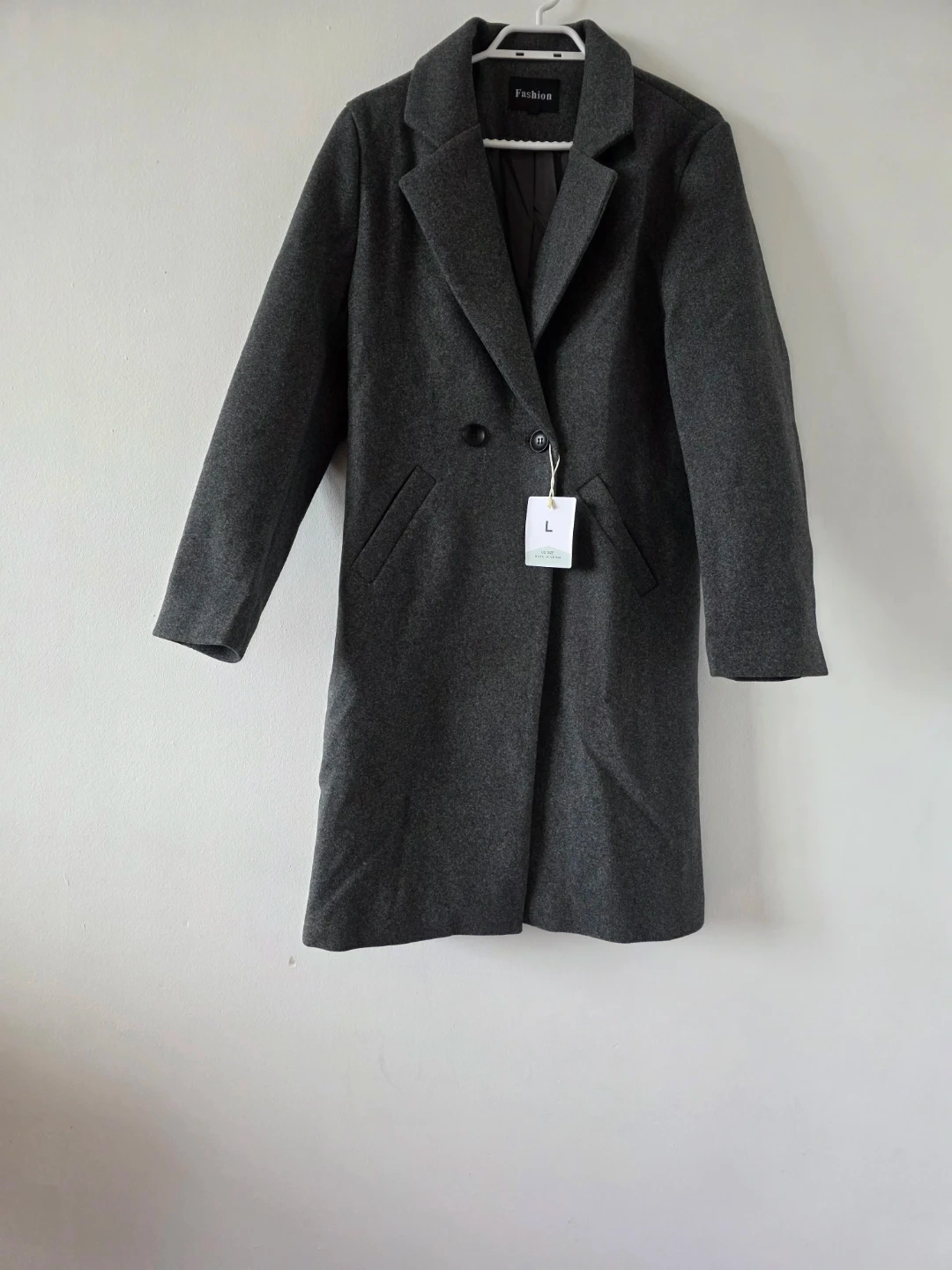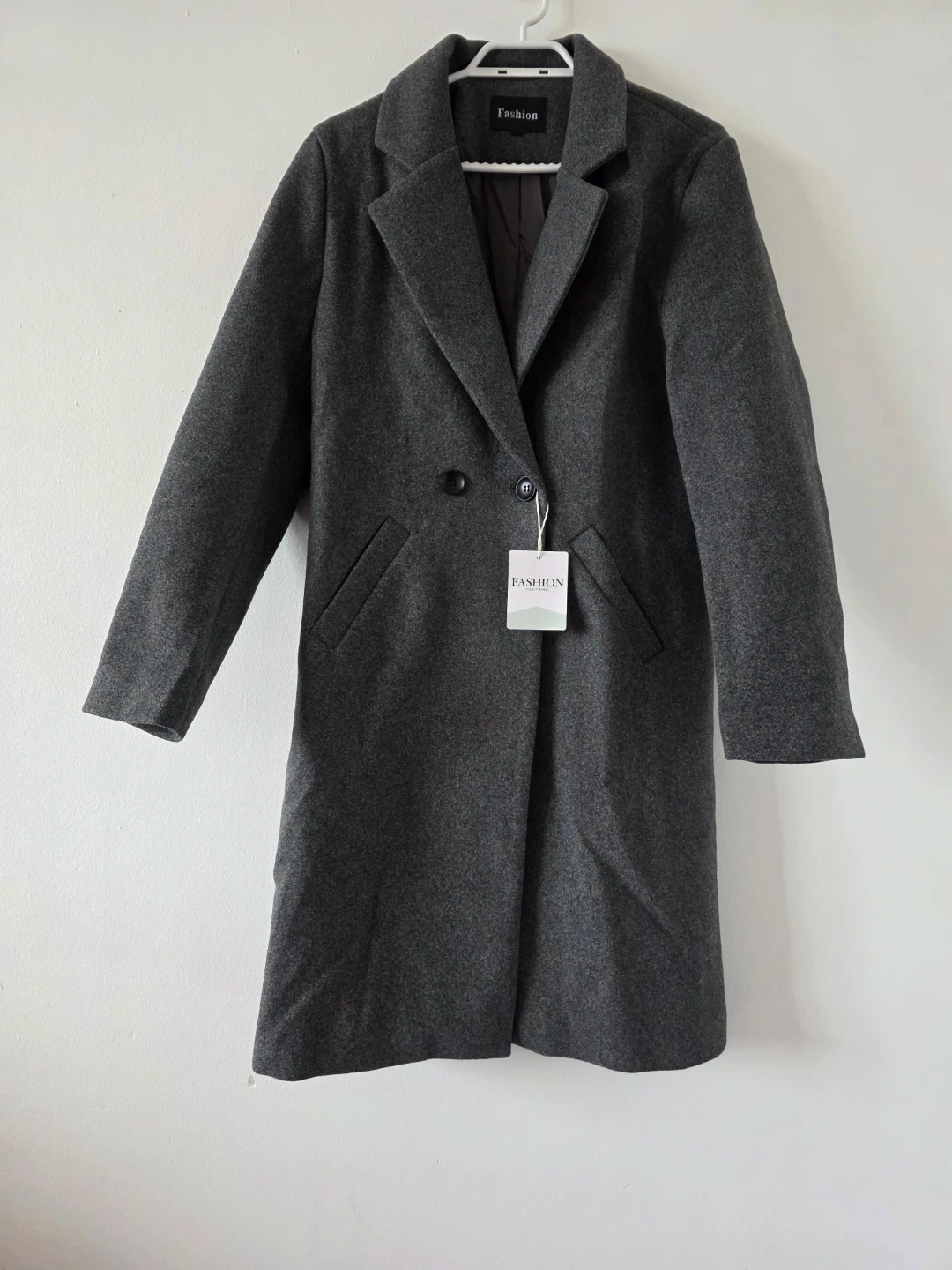A stylish grey overcoat from the Fashion brand. It's made from a wool blend and features a classic lapel design. This coat offers a warm and sophisticated look for cooler weather.