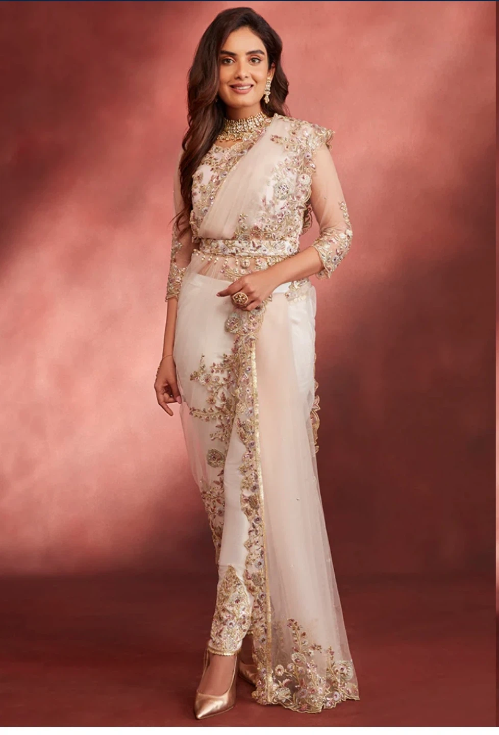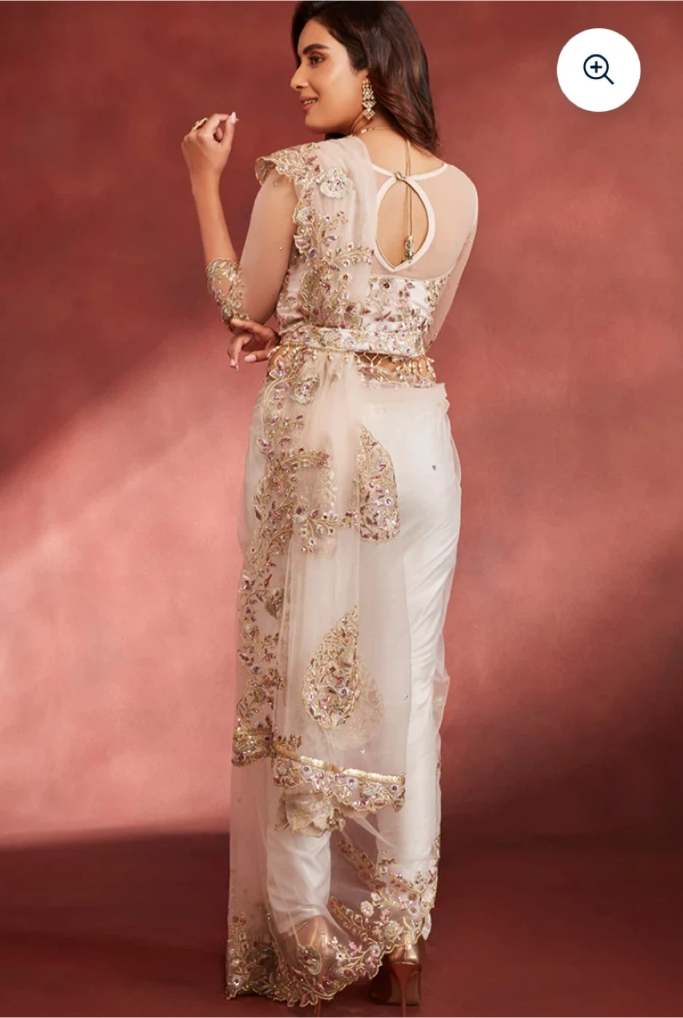 Stunning off-white saree featuring intricate embroidery and beadwork. Sheer sleeves with matching embellished trousers complete this elegant look. Bust: 38", Waist: 34", Hips: 42". Perfect for special occasions!