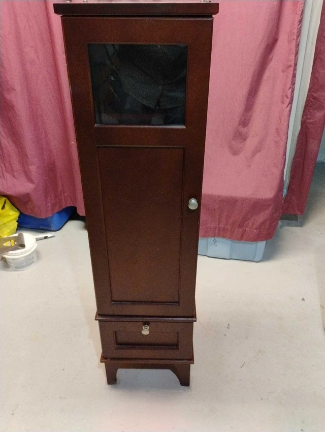 This used cabinet offers versatile storage with its enclosed shelving and convenient drawer. The rich, dark wood finish adds a touch of elegance to any room, making it a functional and stylish addition to your home decor. It is in good condition. Key features include enclosed shelving, a bottom drawer, and a dark wood finish. If you're seeing this ad, the cabinet is still available!