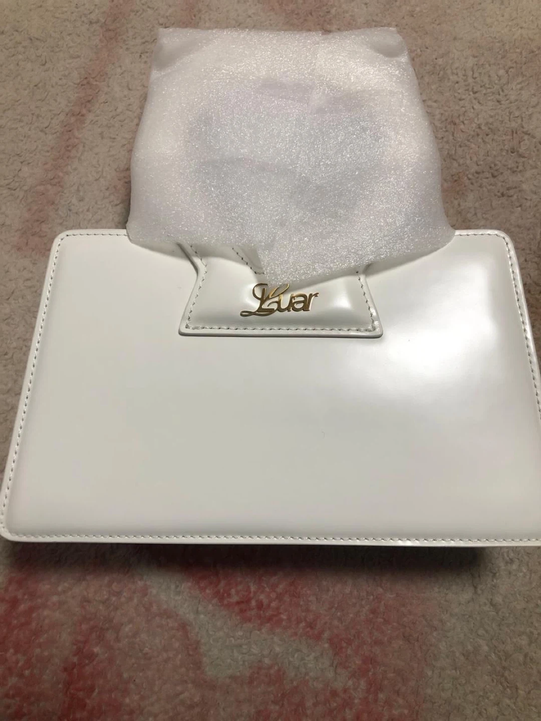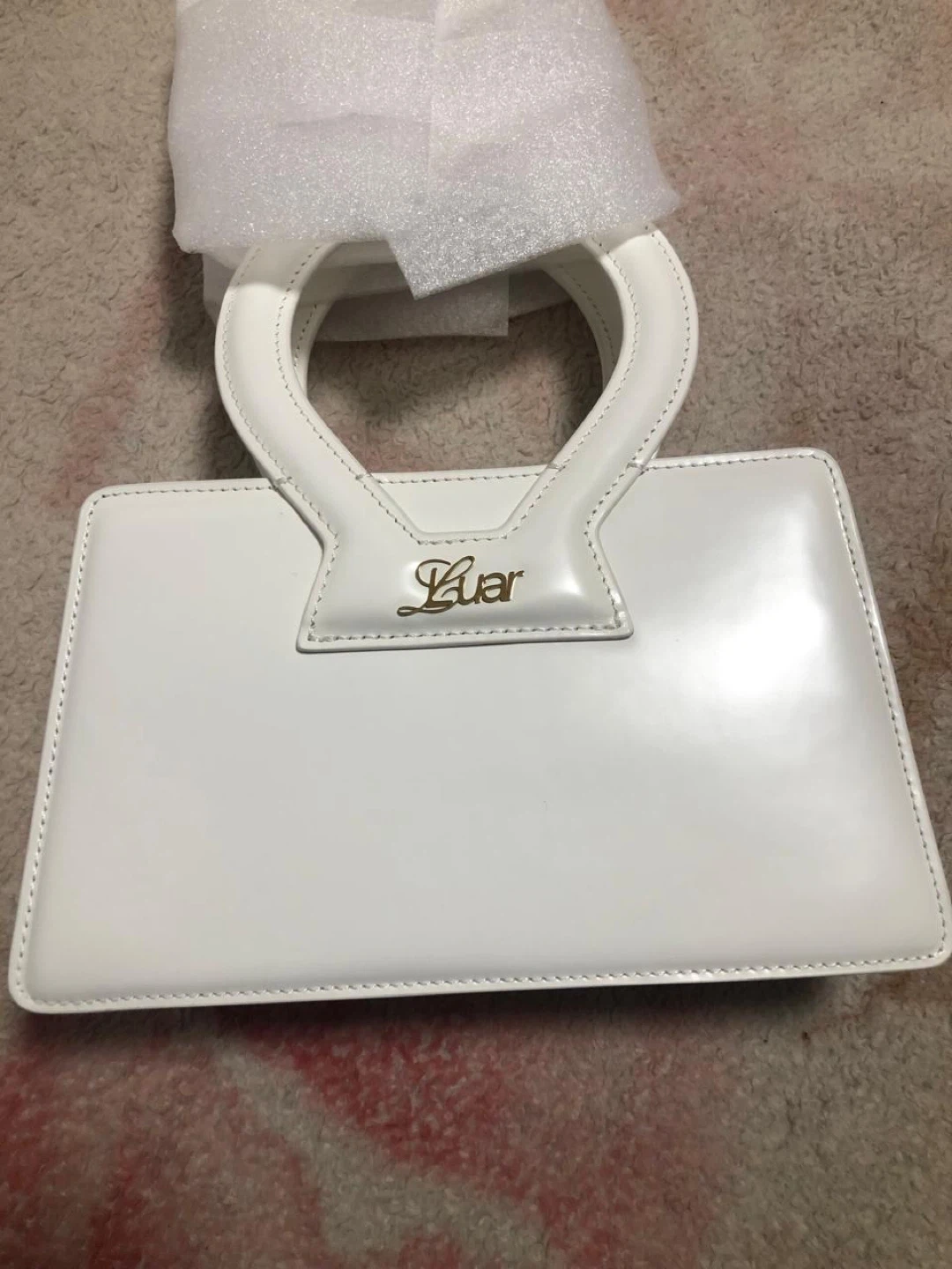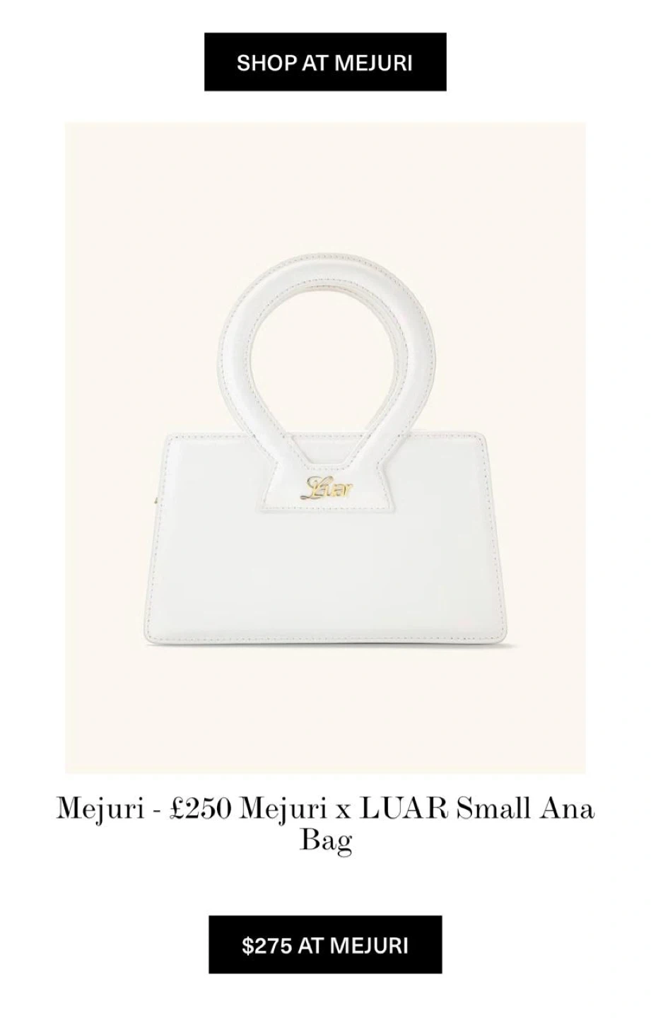This is a white Mejuri x LUAR Small Ana Bag. It's made of leather and comes with a dust bag and original box. A chic accessory for everyday use! Never used.