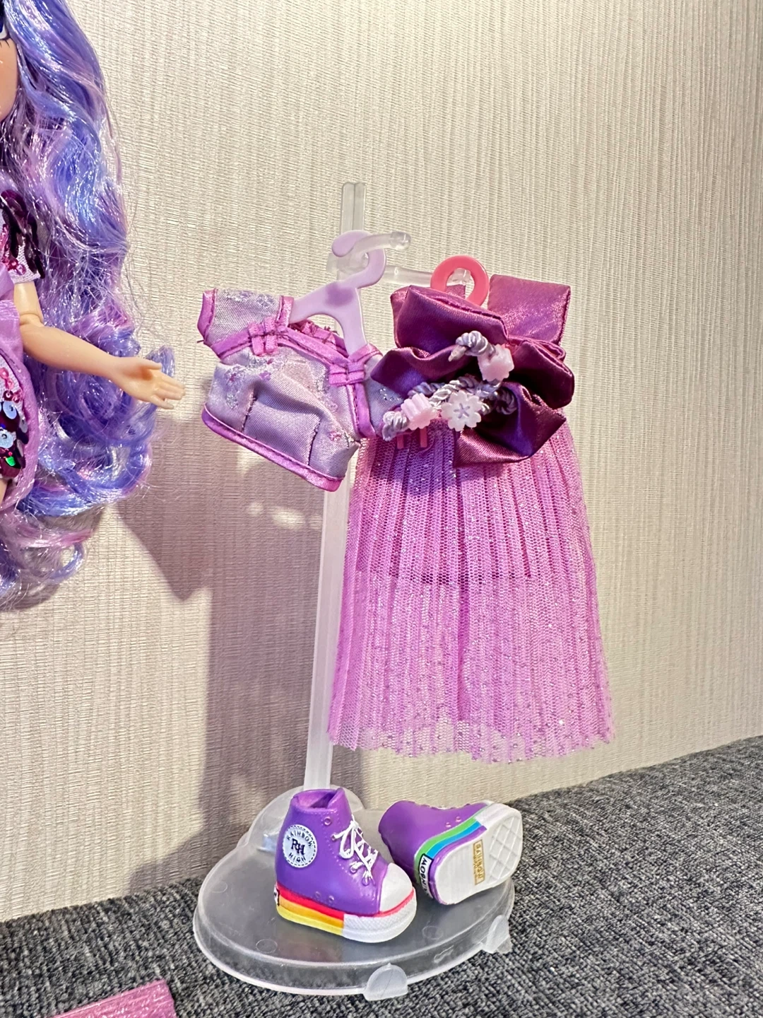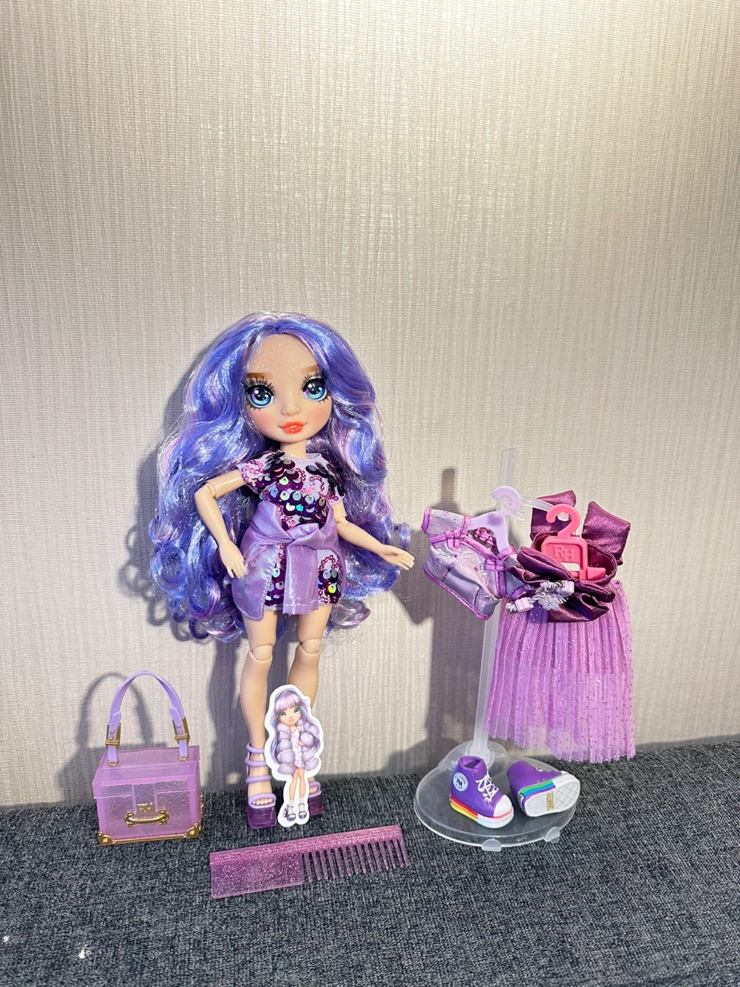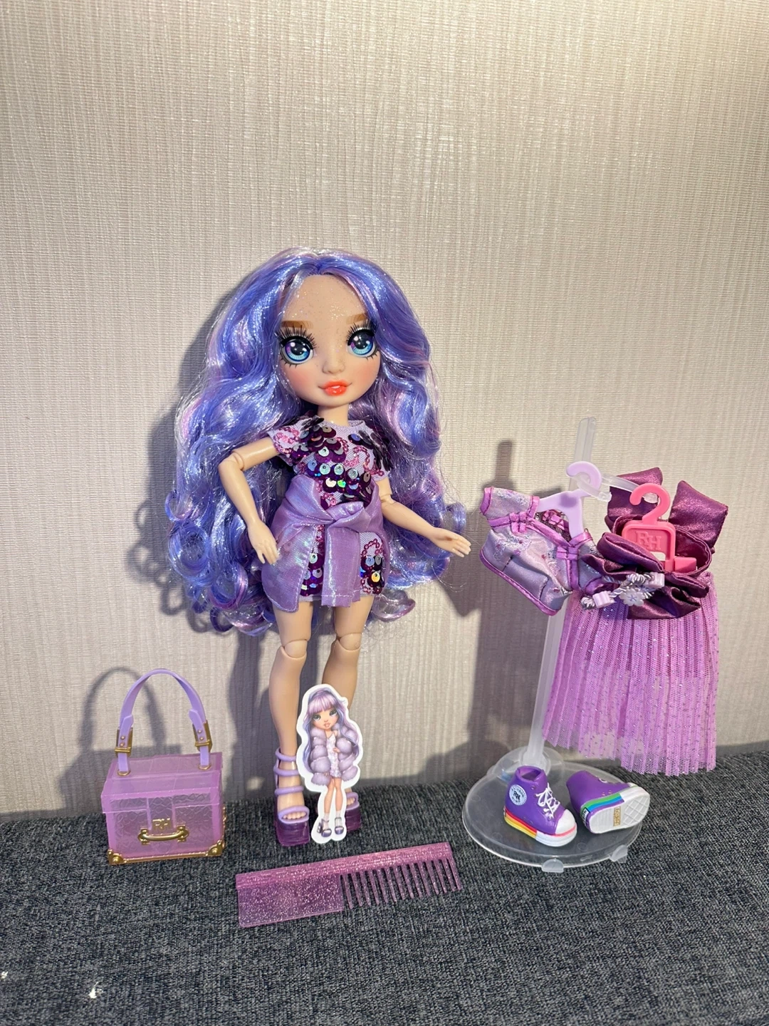 This Rainbow High doll comes with multiple outfits and accessories. It features a purple-themed wardrobe including a dress, jacket, and shoes. Also included is a doll-sized handbag and a comb.