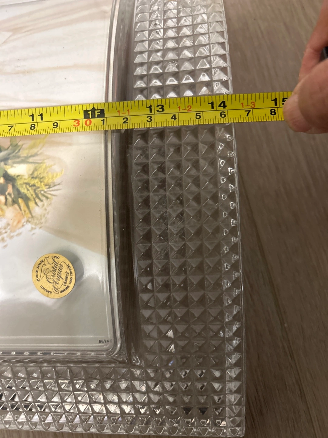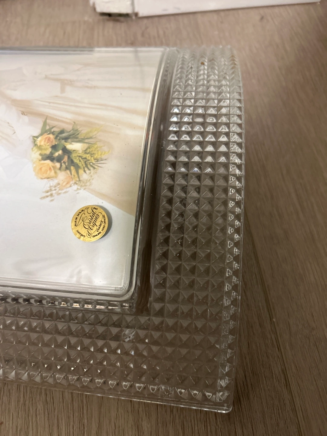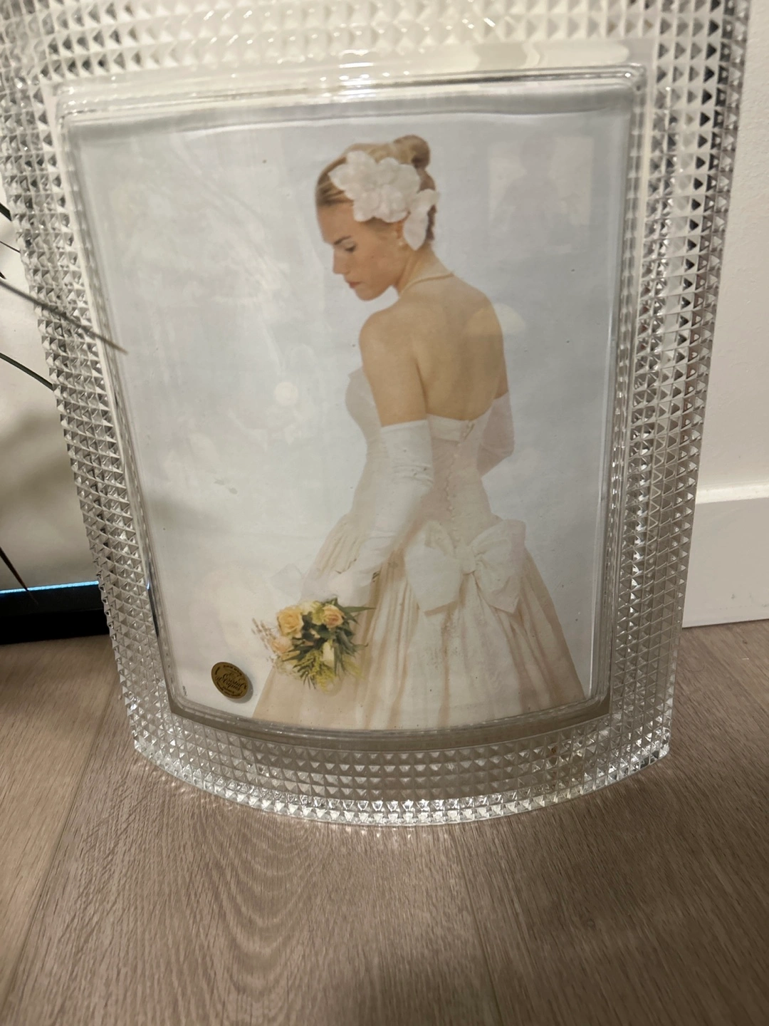 This crystal photo frame features a textured, diamond-cut border. It's designed to hold a standard photo size. The frame has a substantial, decorative look.