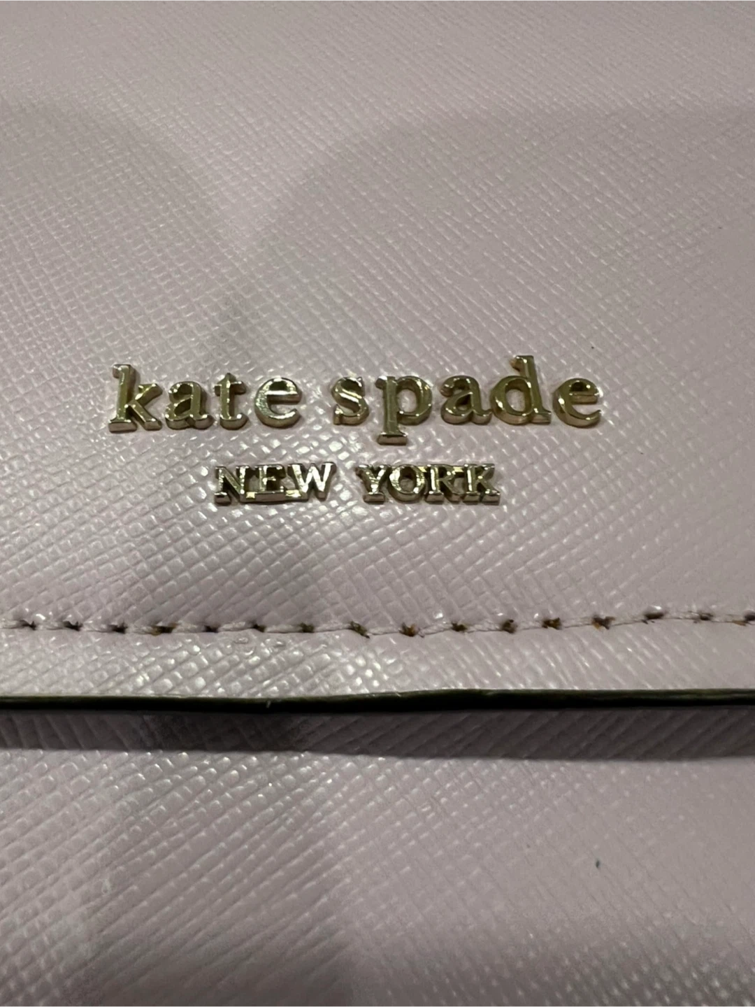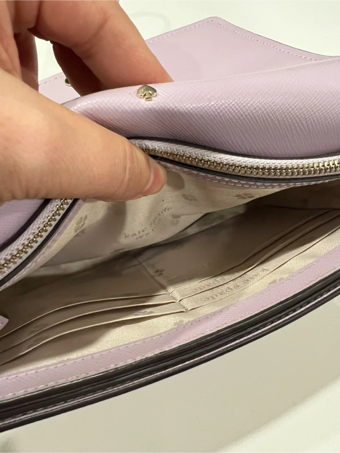 This is a Kate Spade New York shoulder bag. It's made of lavender saffiano leather. It features a silver-tone chain strap and a front flap closure with a snap button. The interior has multiple card slots and a zippered pocket. This bag is perfect for a night out or everyday use!