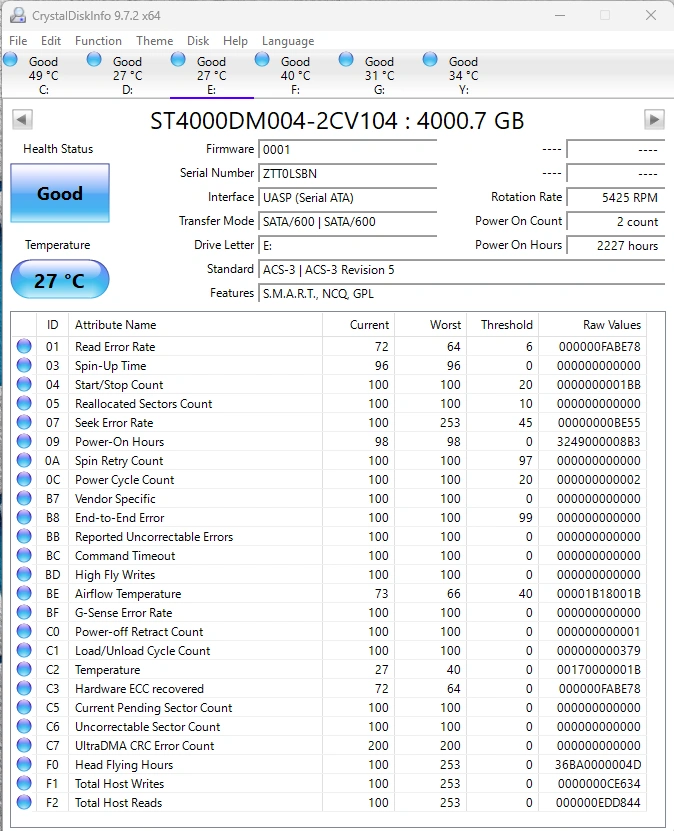Refer to screenshots of DiskInfo for the health of the drives.