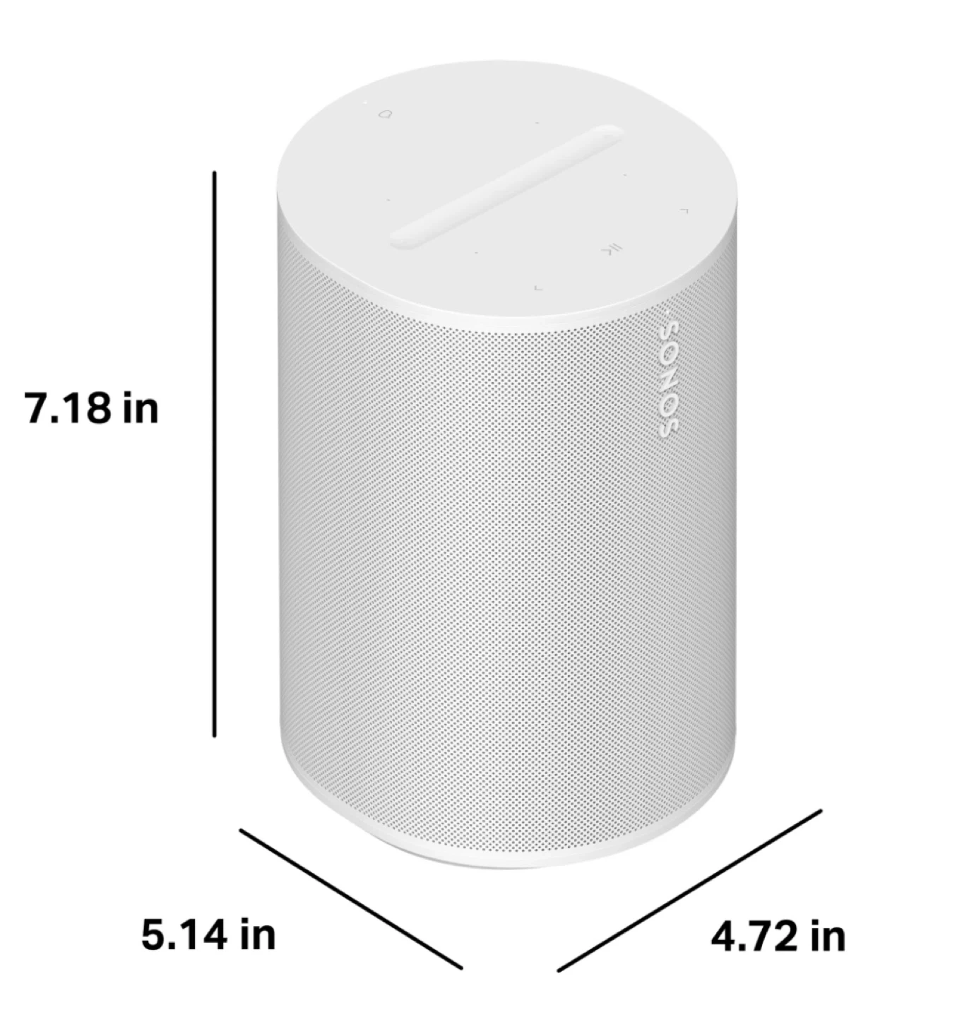 Sonos Era 100 smart speaker. It supports Sonos Voice Control and works with Apple AirPlay. Made for iPhone, iPad, and iPod. Dimensions are 7.18 inches tall, 5.14 inches wide, and 4.72 inches deep.