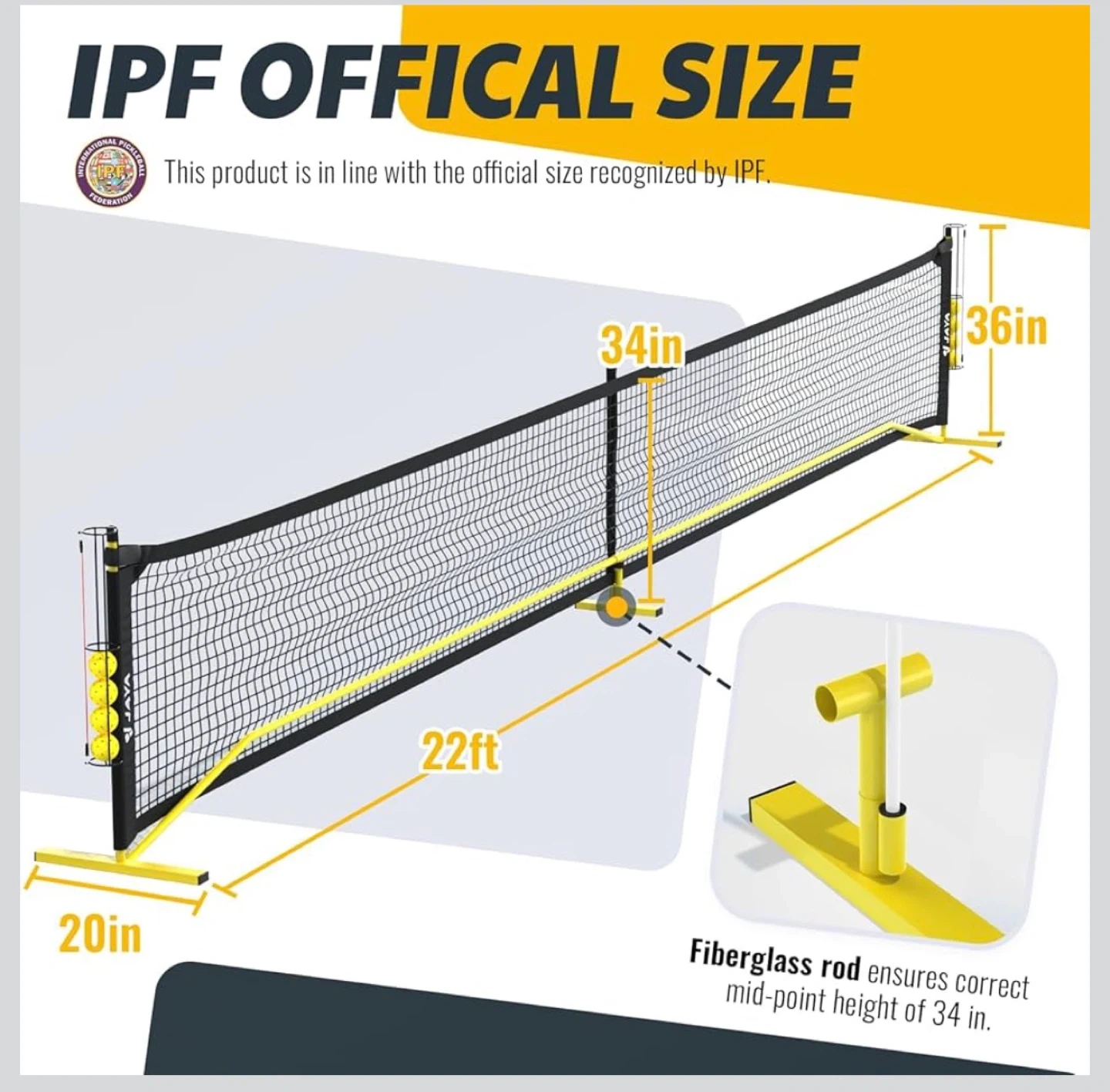 This portable pickleball net system is IPF official size. It's 22ft long and 36in high. Includes fiberglass rod for mid-point support and a carrying bag. Play pickleball anywhere!