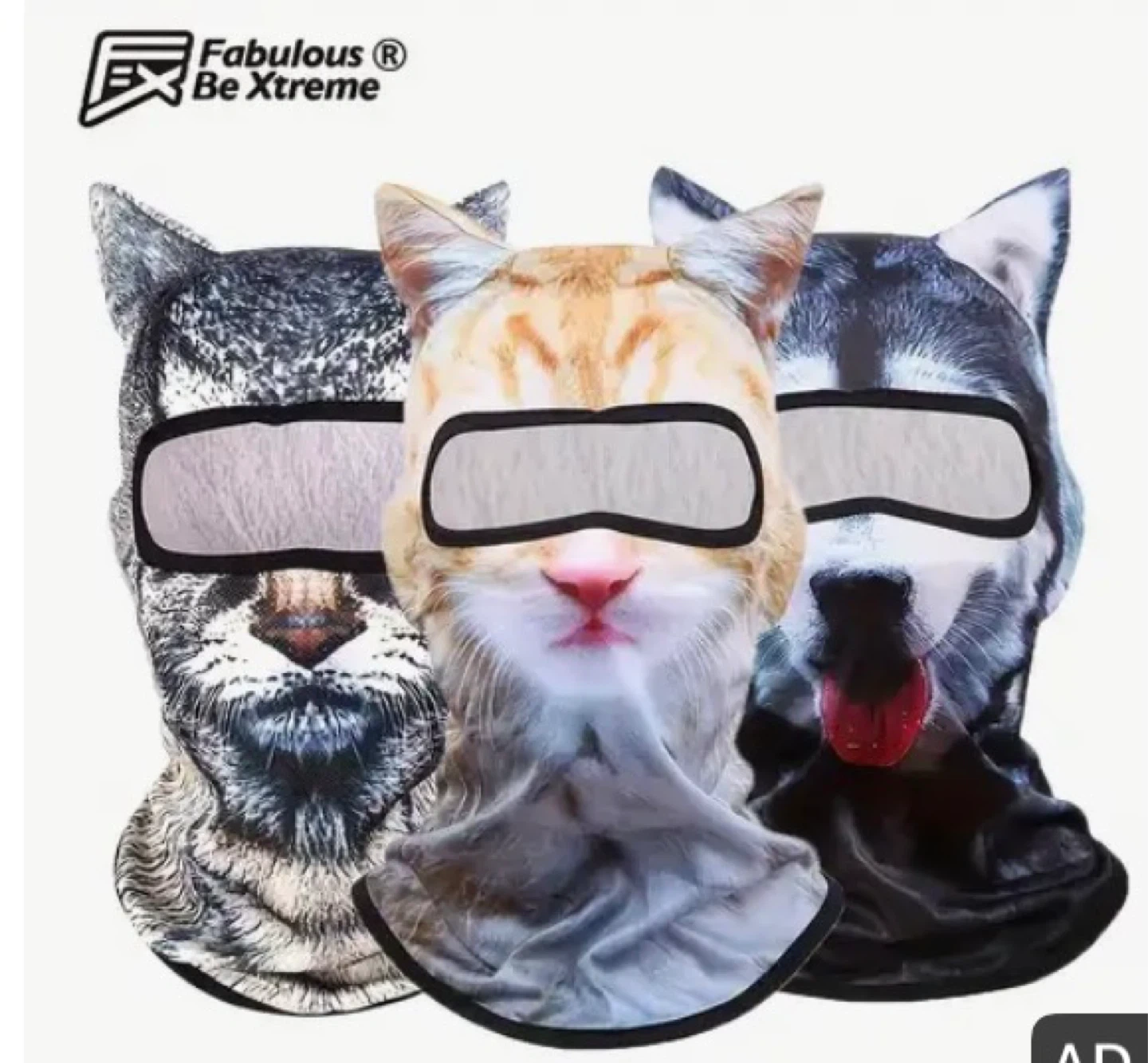 These face masks feature fun animal face designs, including a cat and two wolf-like breeds. They're made from a breathable fabric. These are great for costumes or outdoor activities!