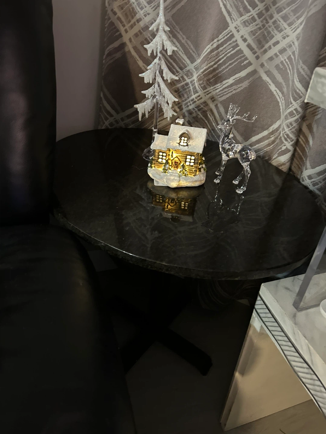 This round side table features a granite top with a pedestal base. It's perfect for placing next to a sofa or armchair. The speckled granite offers a durable and stylish surface.