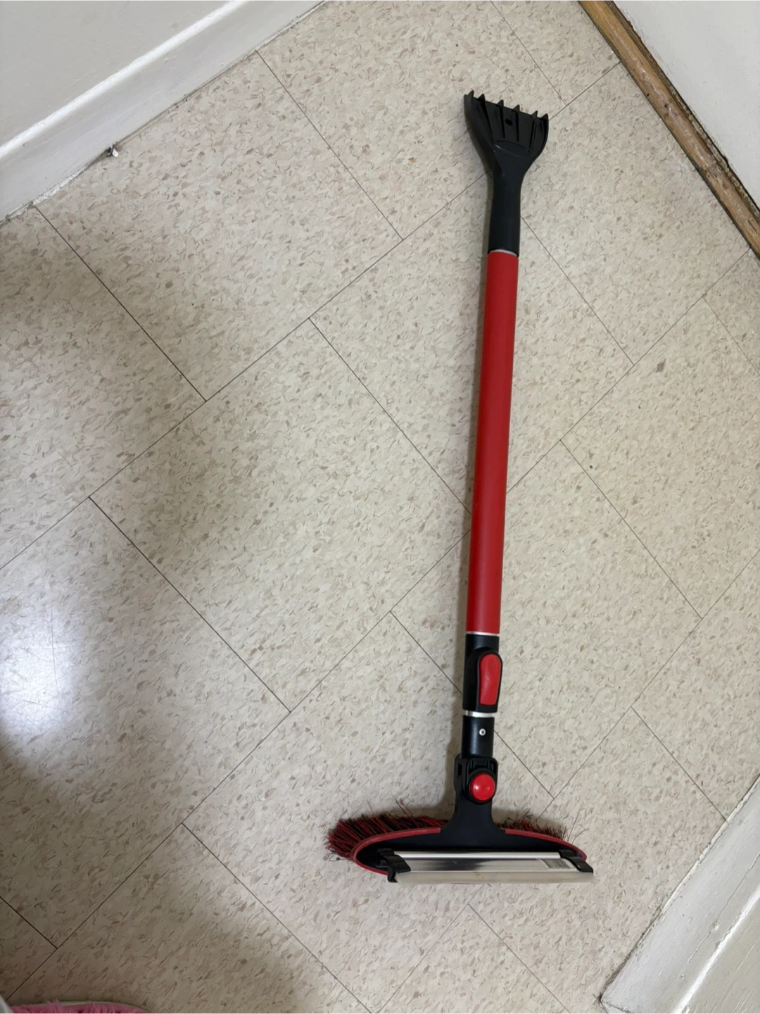 This extendable snow brush features a built-in ice scraper for clearing your windshield. It has a sturdy red handle and a pivoting brush head. The scraper's teeth are designed to break up thick ice. It's useful for any driver during winter months! $5