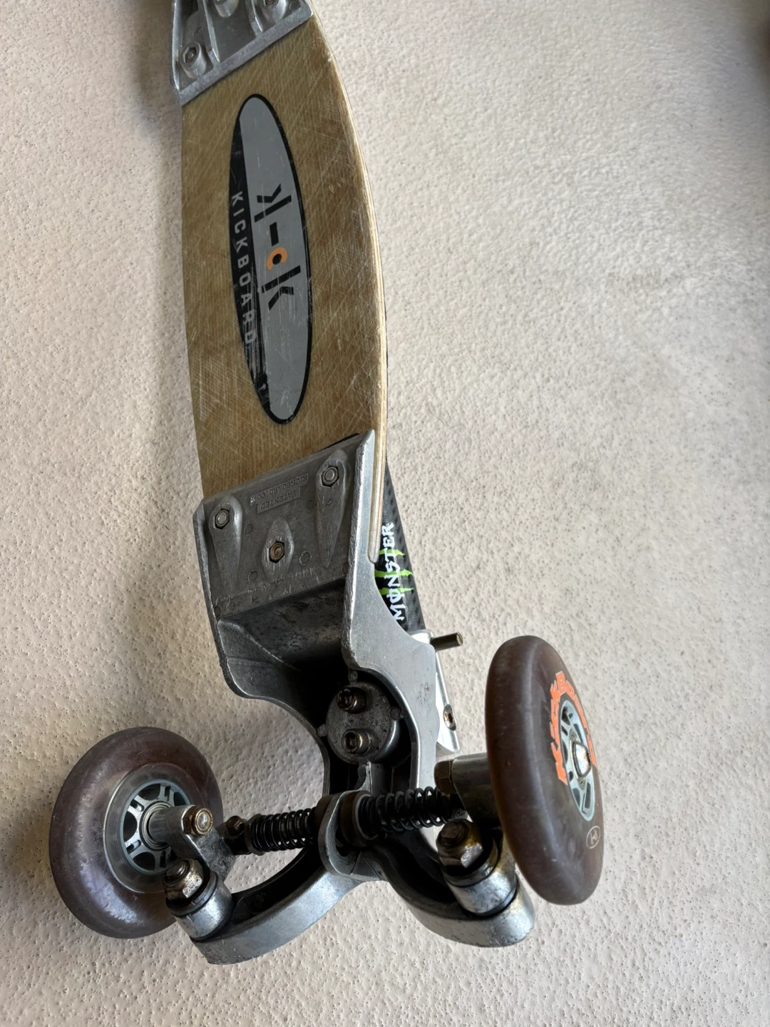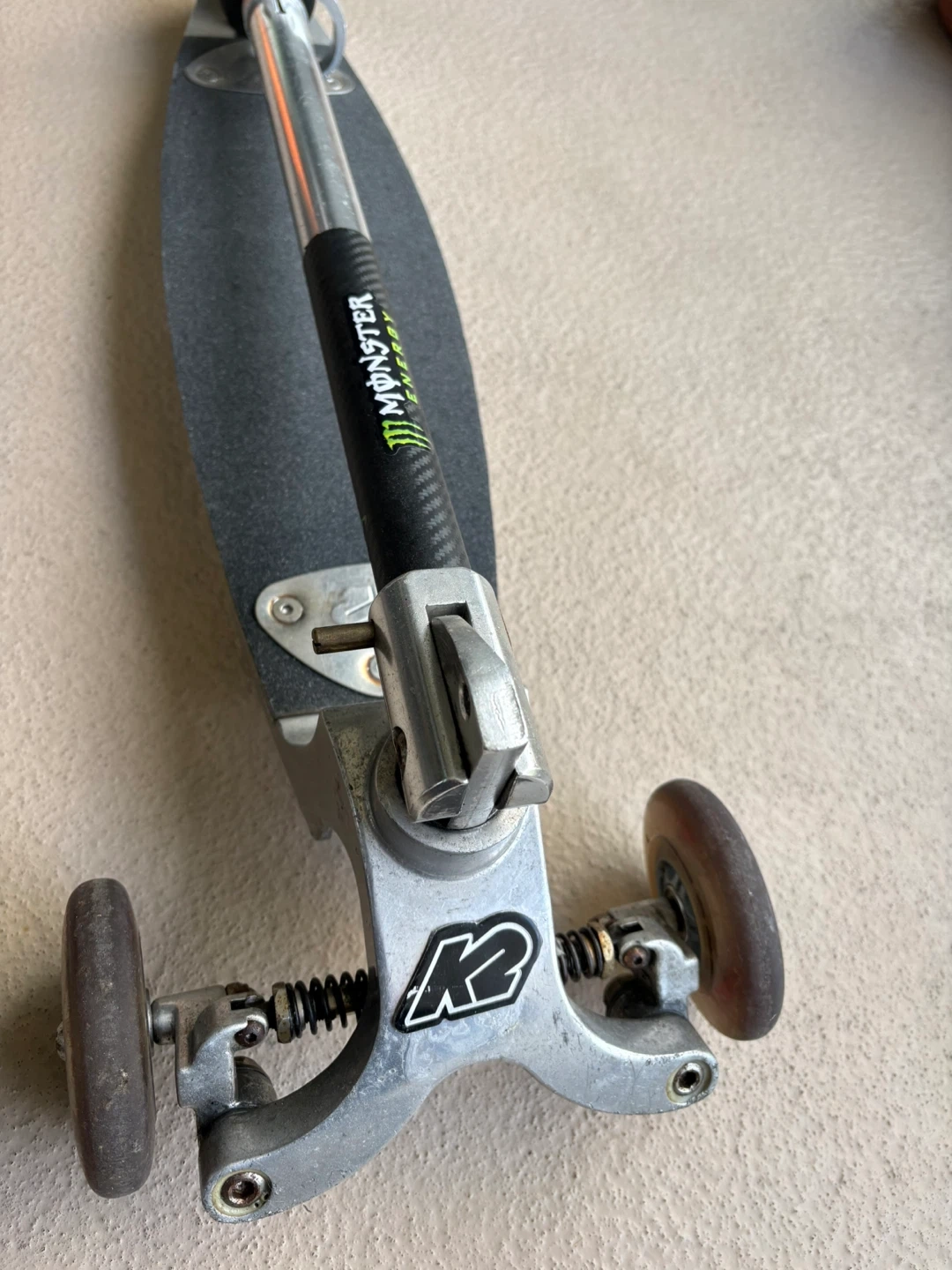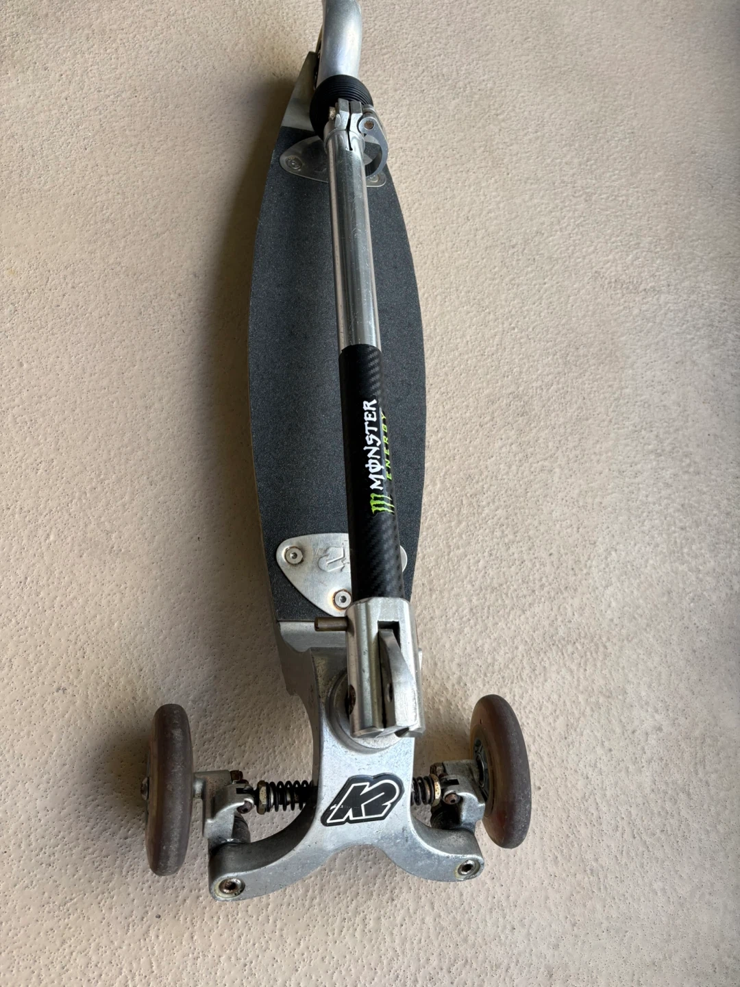 This is a K2 Kickboard scooter. It features a three-wheel design for stability and has a "Monster Energy" grip on the handlebars. The deck is made of wood with a grip tape surface.