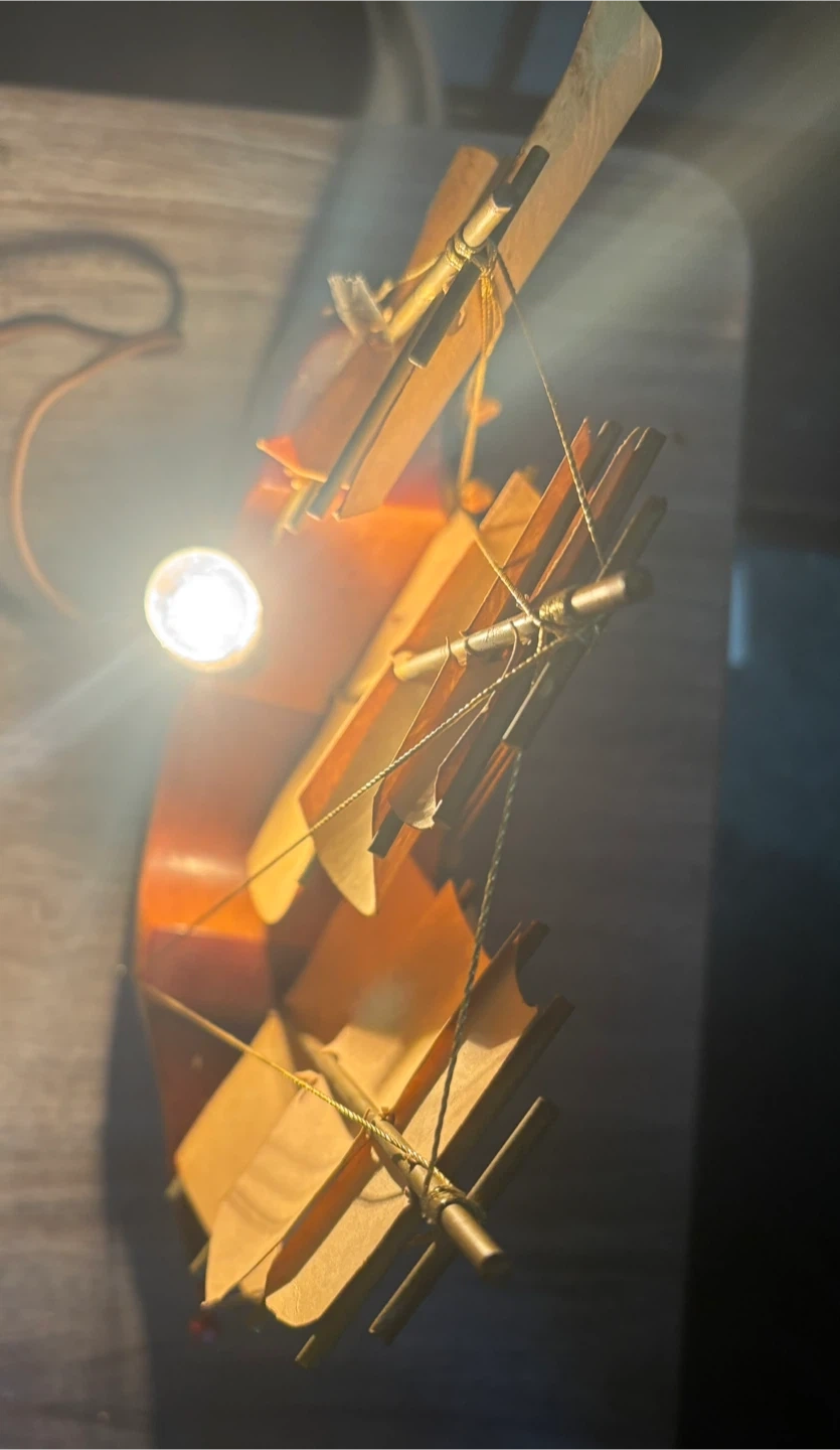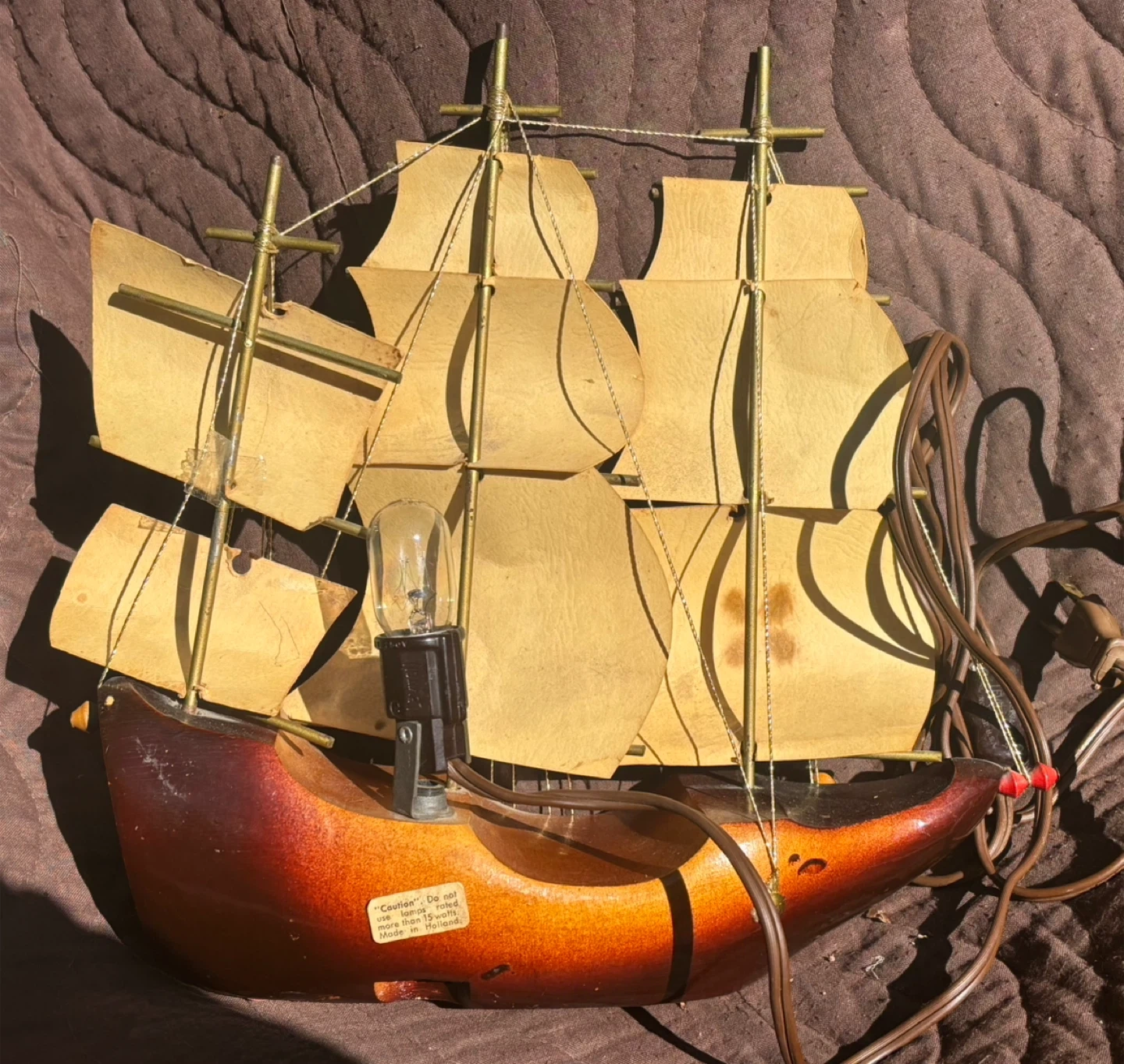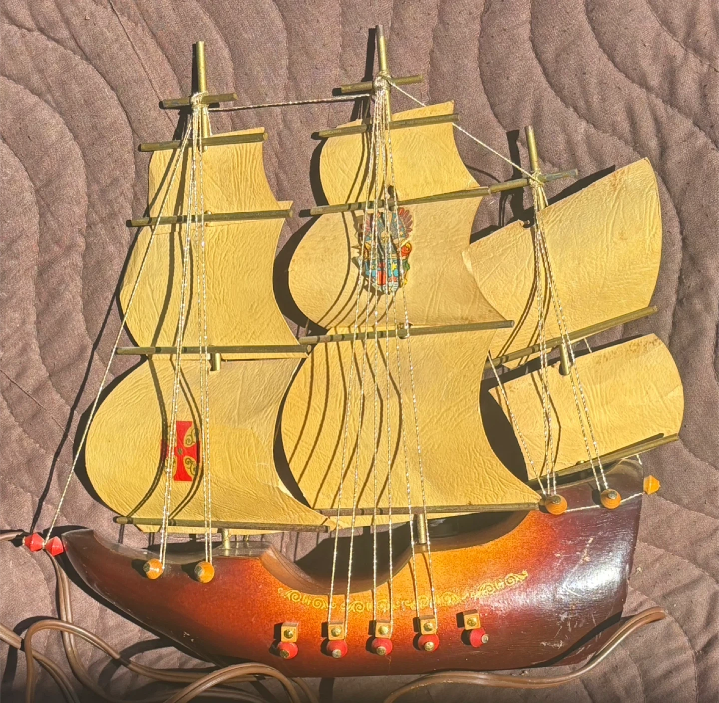 This vintage Viking ship lamp features a detailed wooden hull and fabric sails. It's lit by a single bulb, casting a warm glow. The lamp includes a power cord and a decorative crest on the hull.