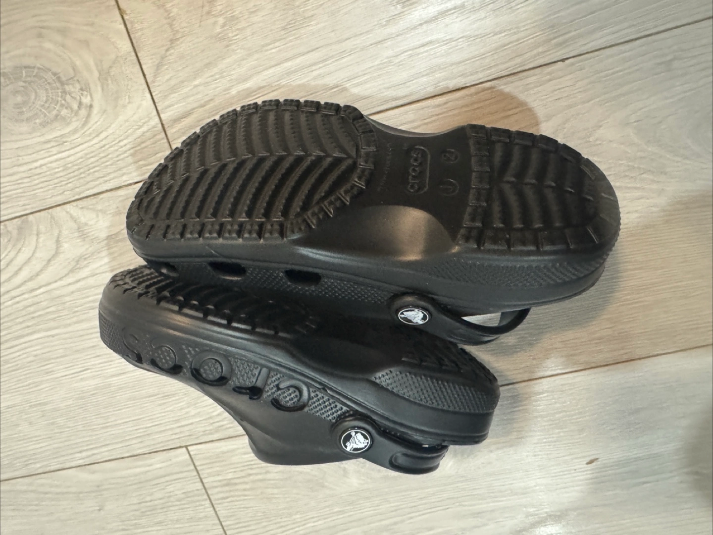 Selling a pair of classic baya Crocs clogs in black! They're super comfy and in great shape. Perfect for everyday wear or just kicking around the house. Size J2