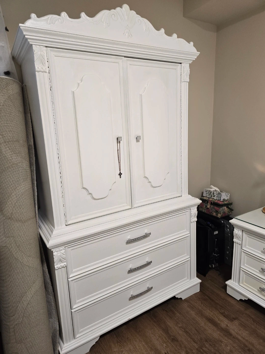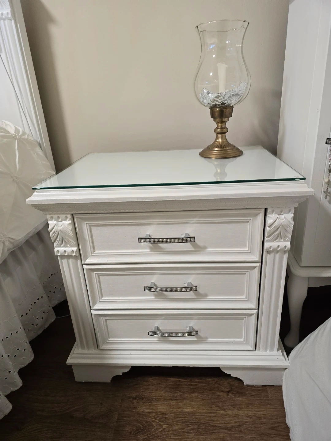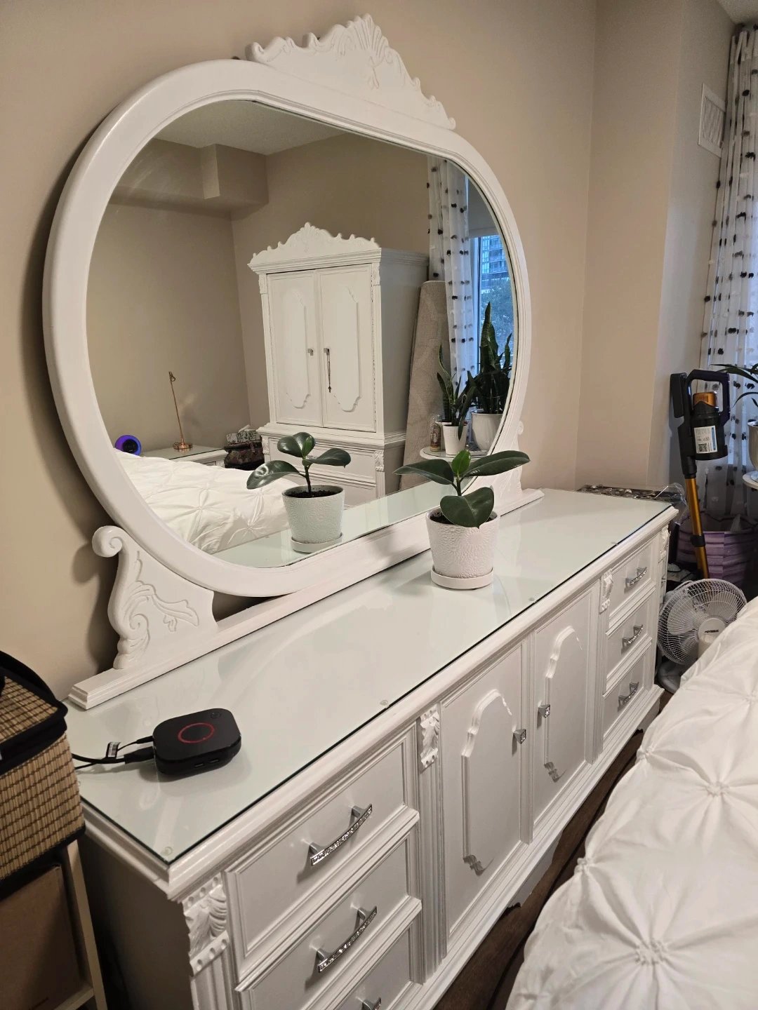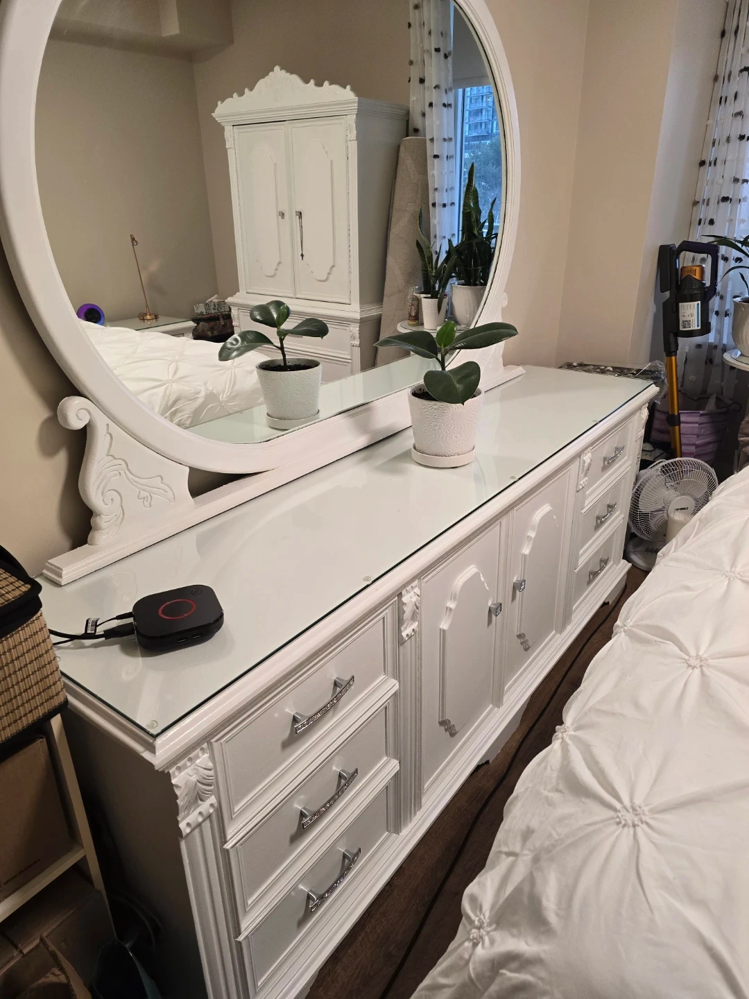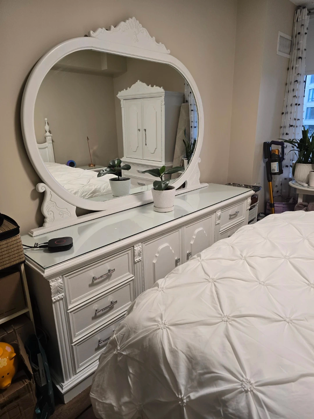 This white dresser features a large oval mirror and a protective glass top. It has multiple drawers and cabinet doors for ample storage. The ornate detailing adds a touch of elegance to any bedroom.