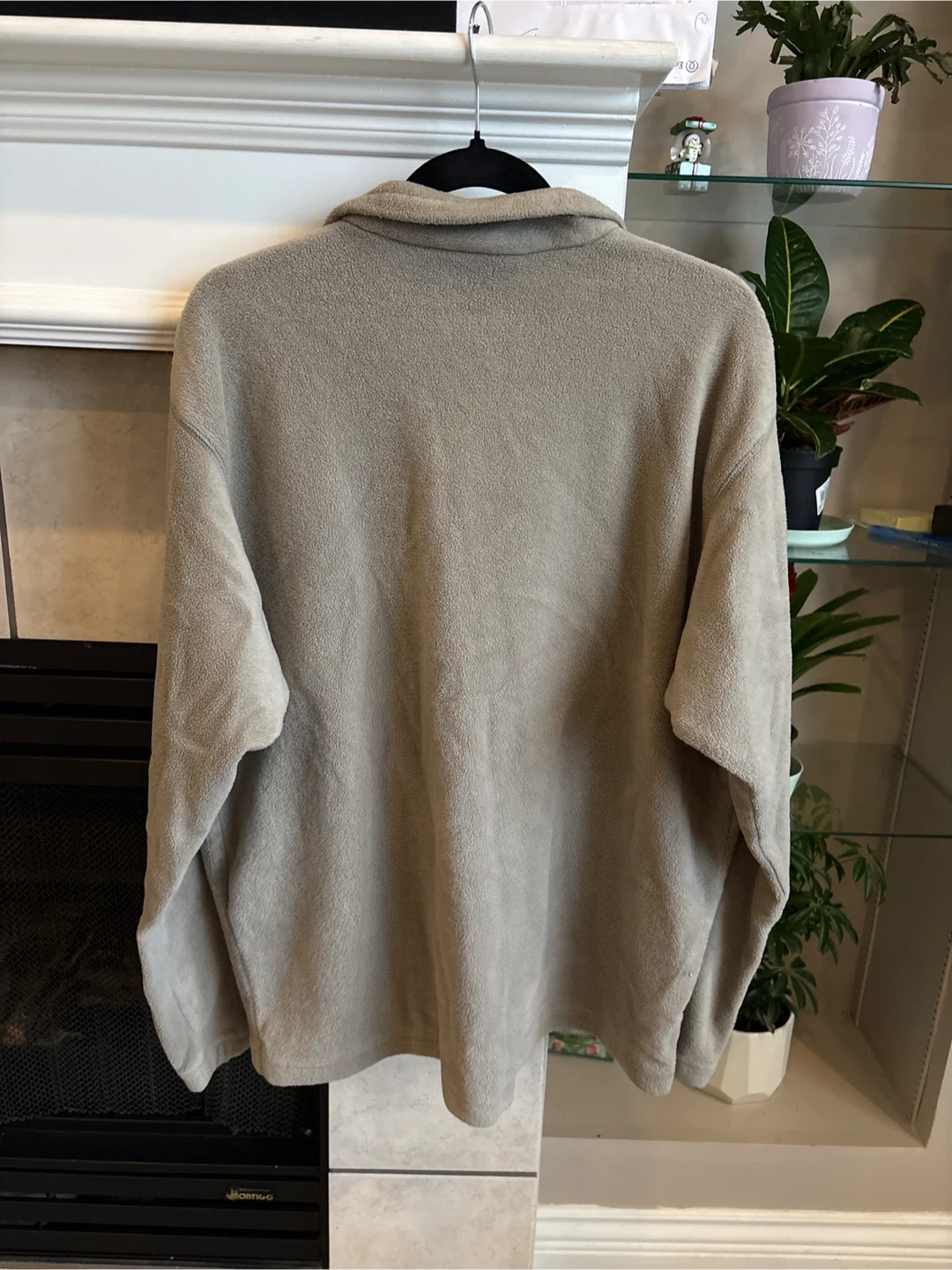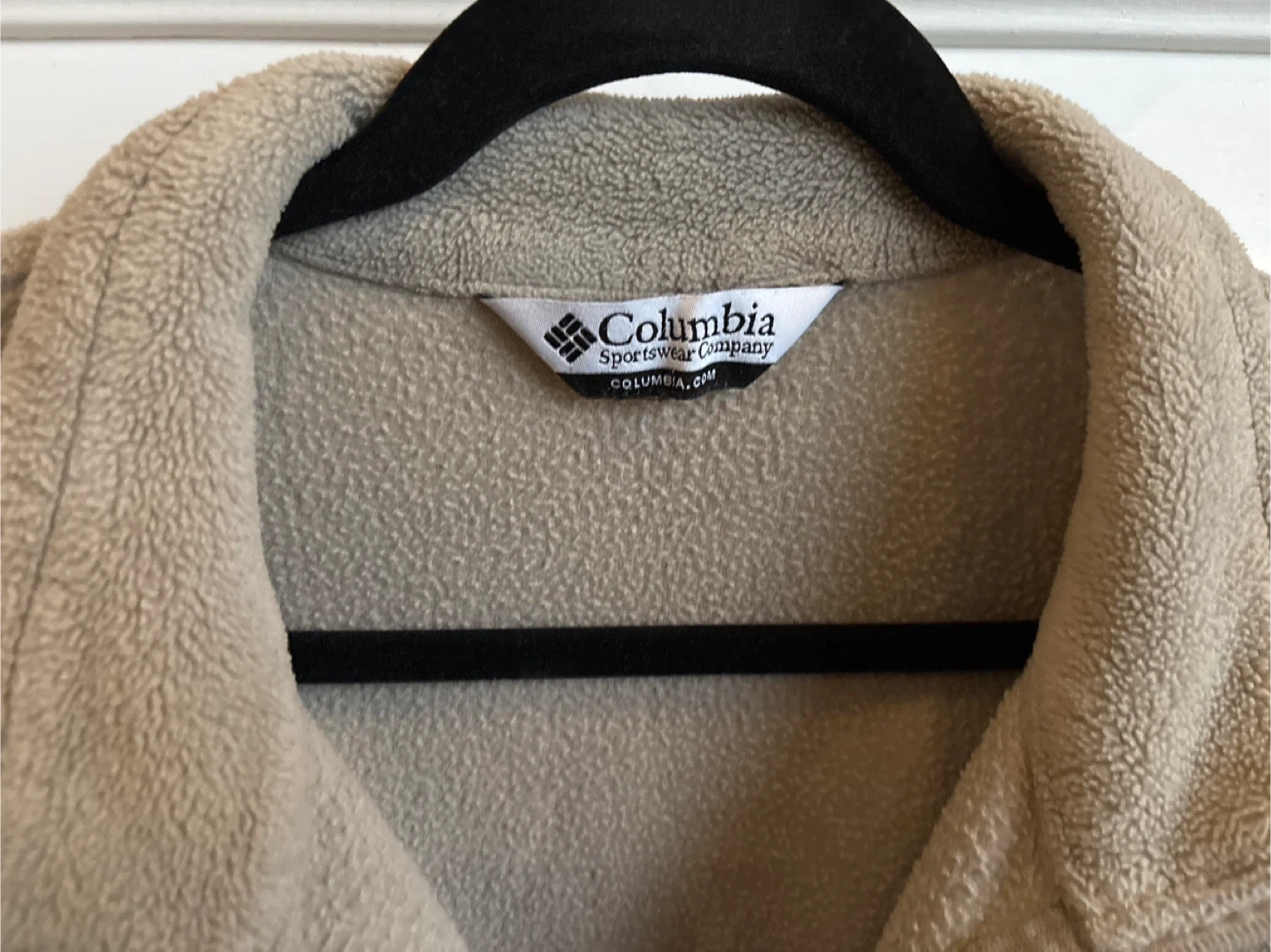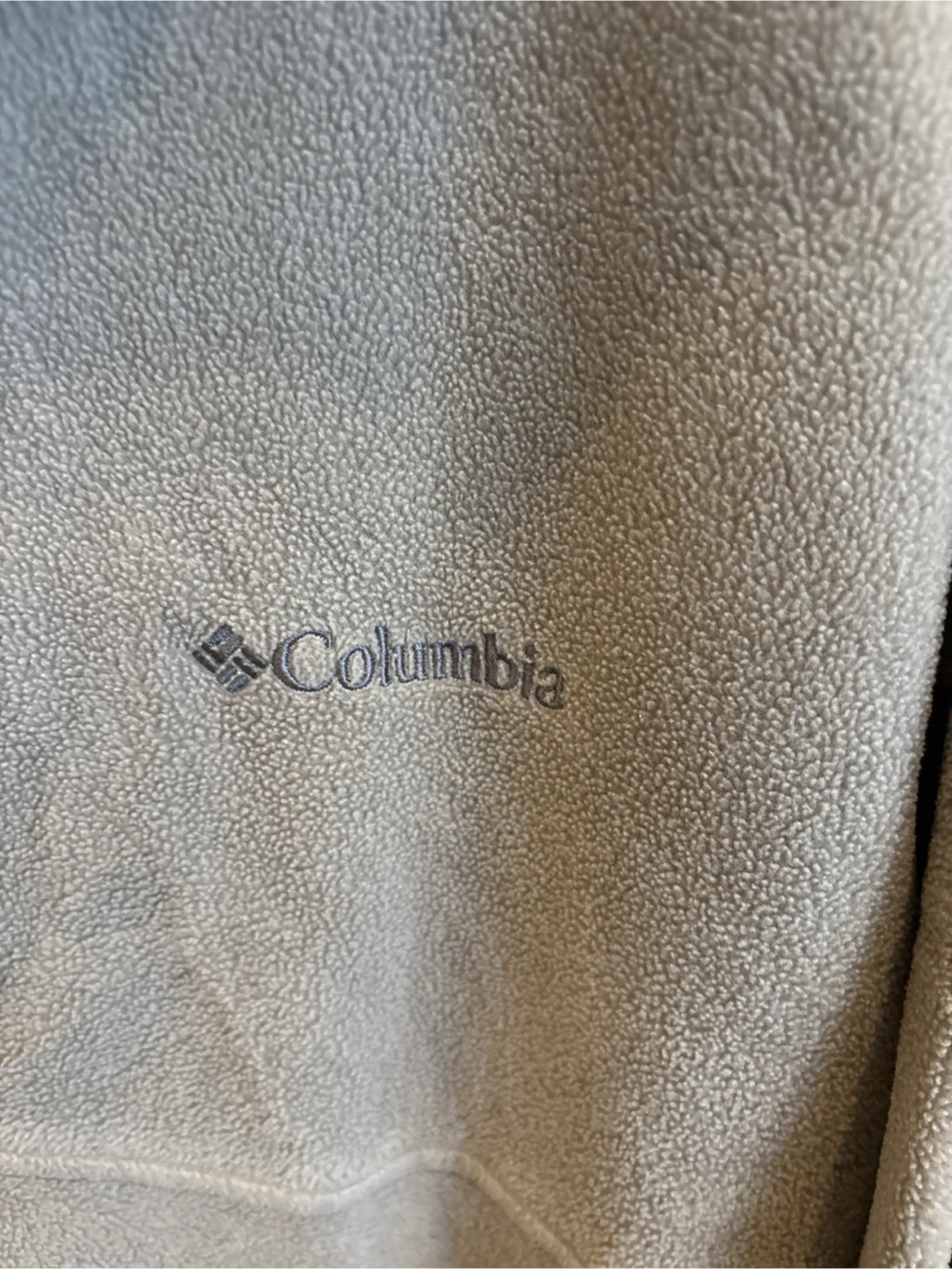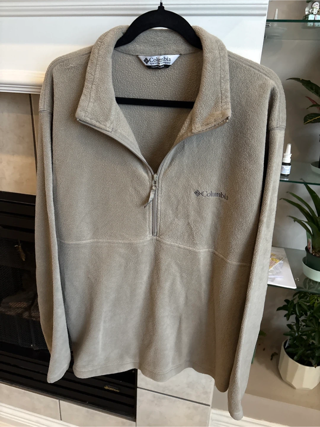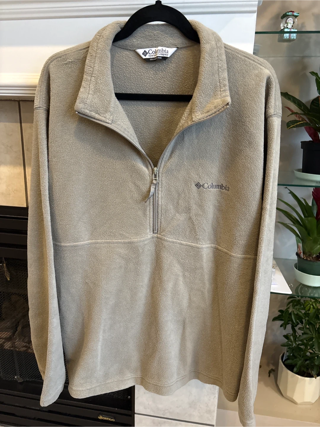 Cozy Columbia Sportswear Company fleece pullover sweater. It's a tan colour and features a quarter-zip closure. Soft fleece material for warmth. Size XL