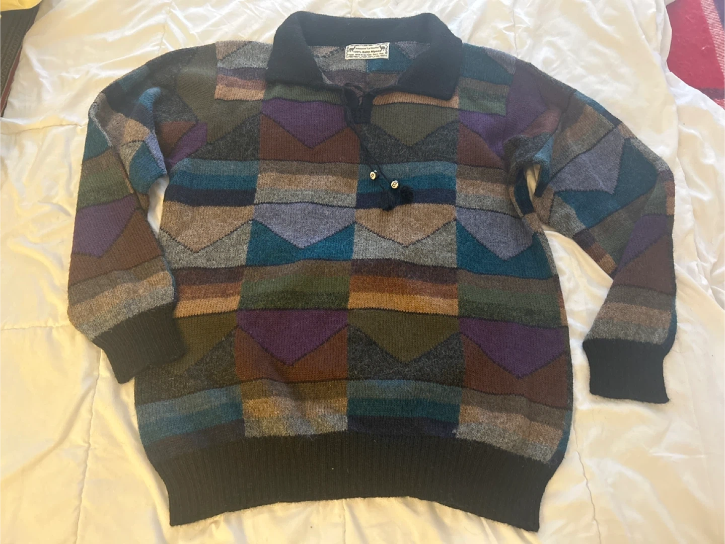 This lot includes three V-neck sweaters. One is a brown V-neck from Joe Fresh. Another is a purple V-neck from Distinction. The third sweater is a colourful knit with a black collar, made from 90% Baby Alpaca. They're great for layering during cooler weather!