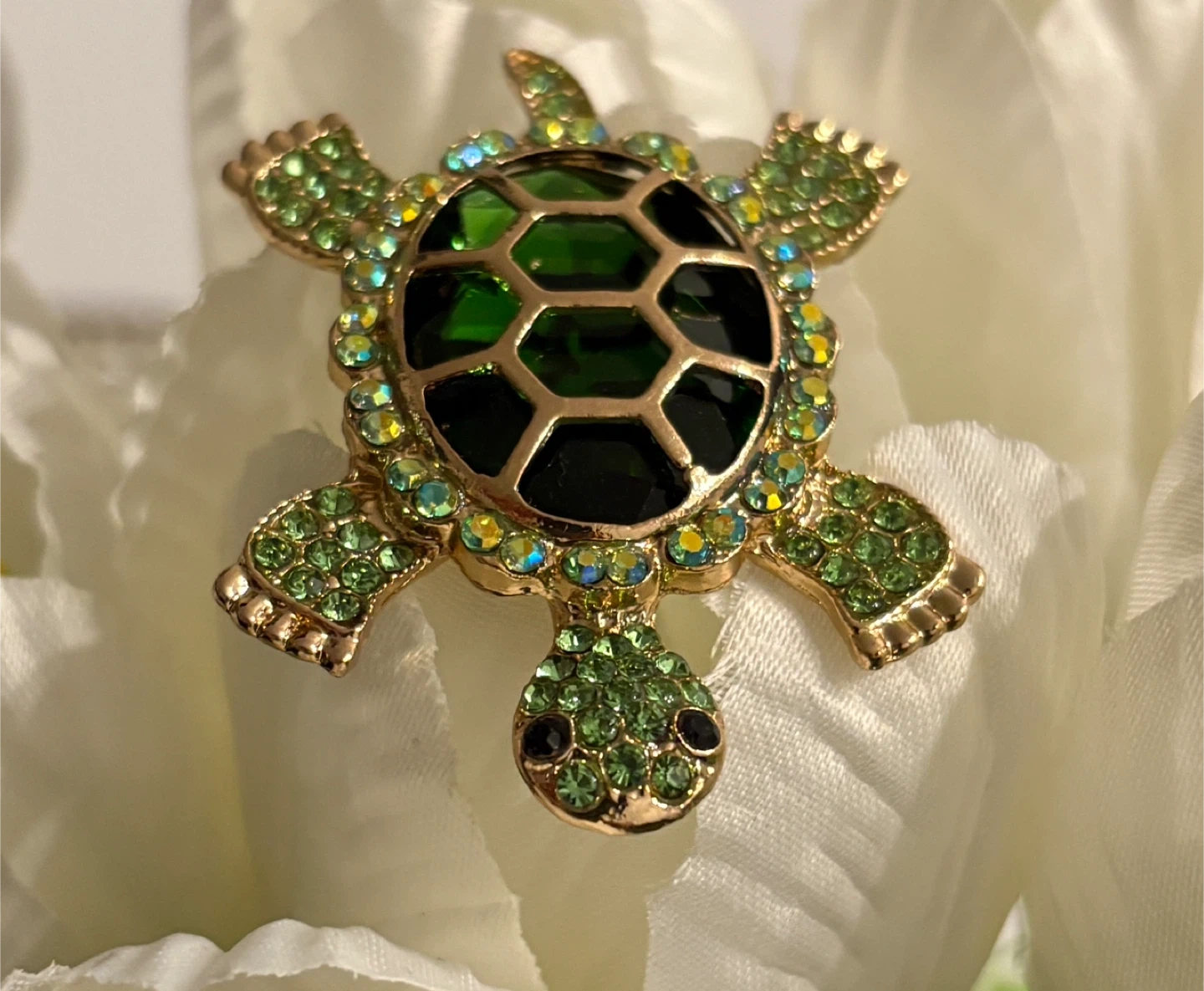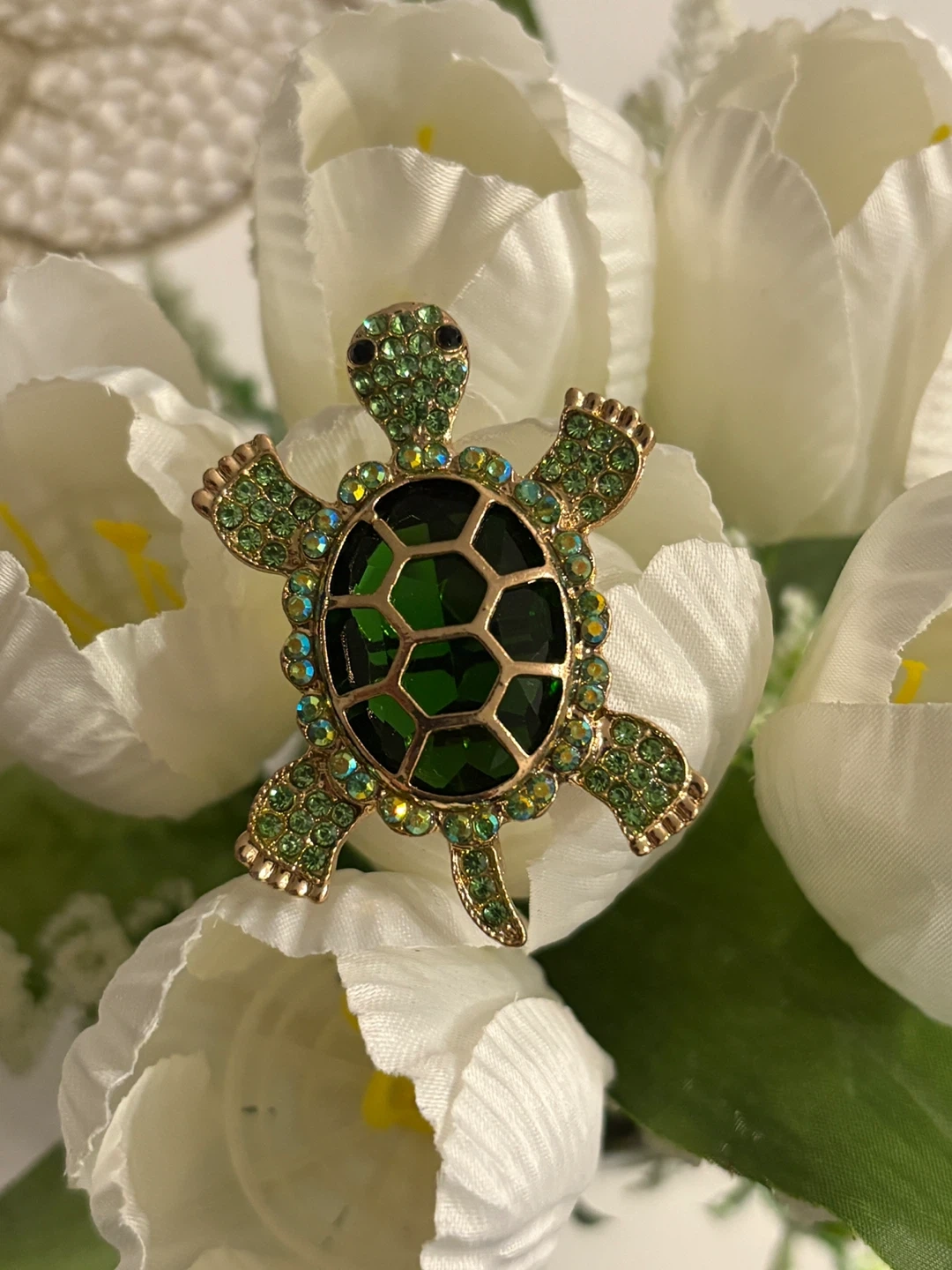 A charming turtle brooch with green rhinestones and a faceted green gem shell. It's gold-toned with an intricate design. This pretty pin is perfect for adding a bit of sparkle to your outfit!