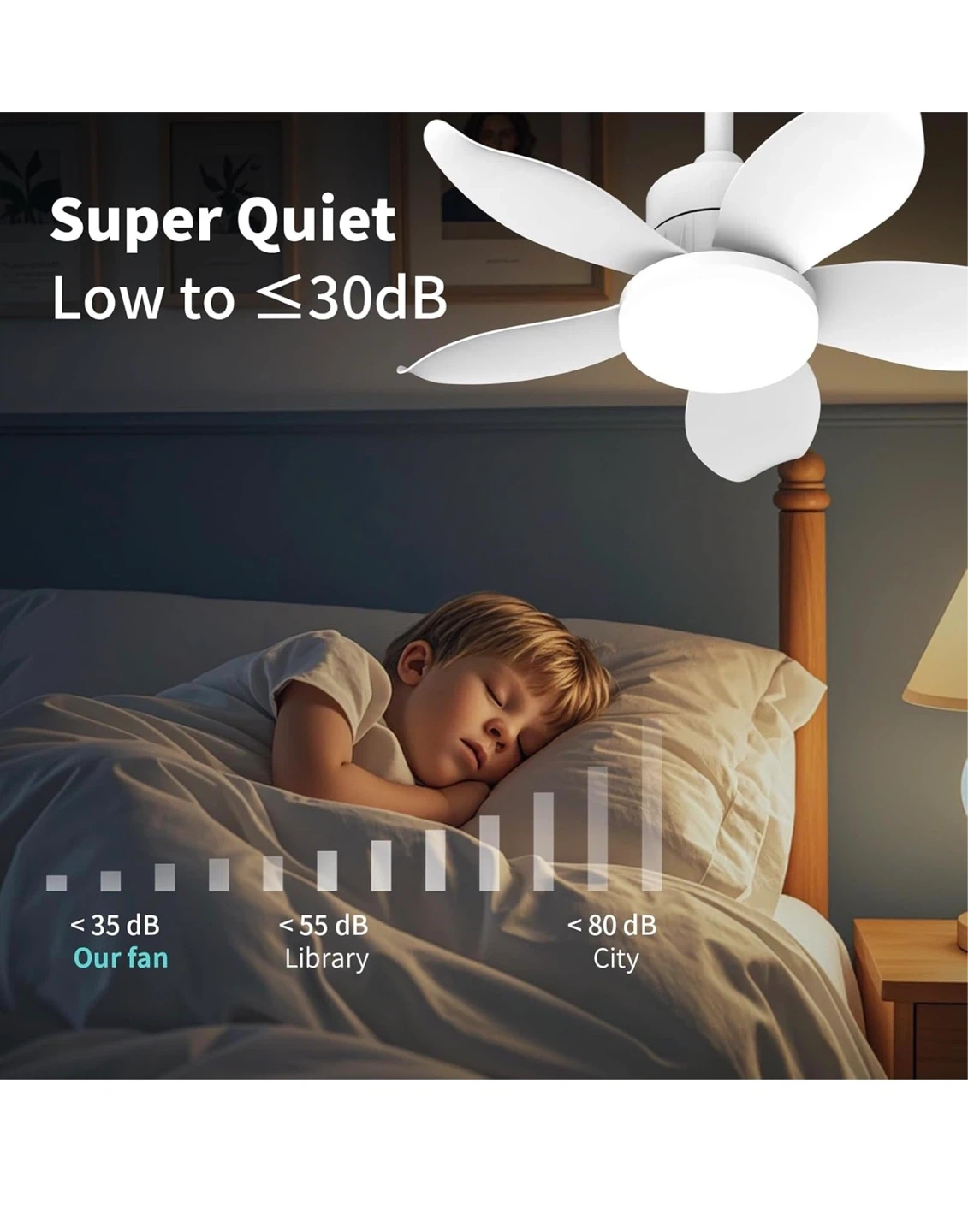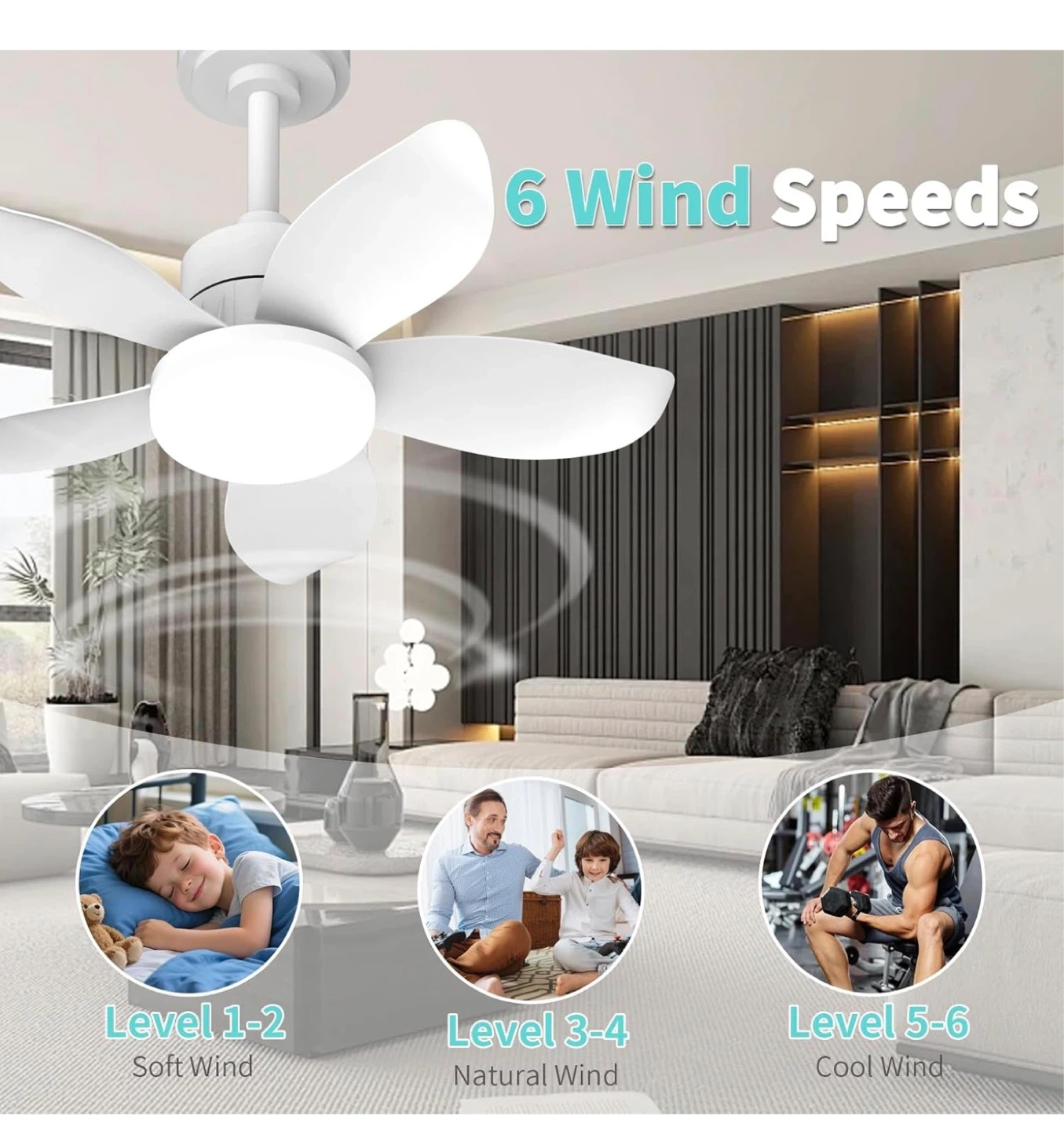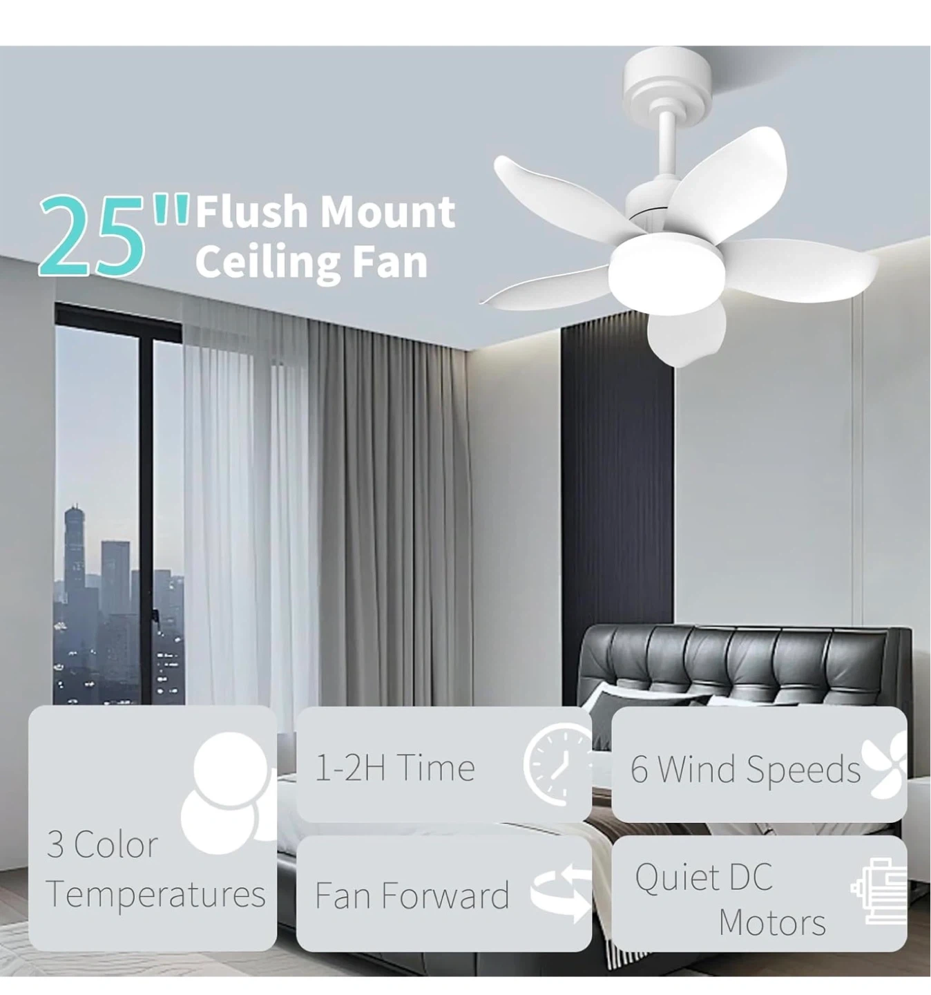 This is a 25-inch white ceiling fan with a reversible, dimmable LED light. It features a quiet DC motor and offers 6 speed options with adjustable color temperatures (3000K, 4500K, 6500K). The fan is constructed with high-quality ABS and a sturdy, lightweight cover.