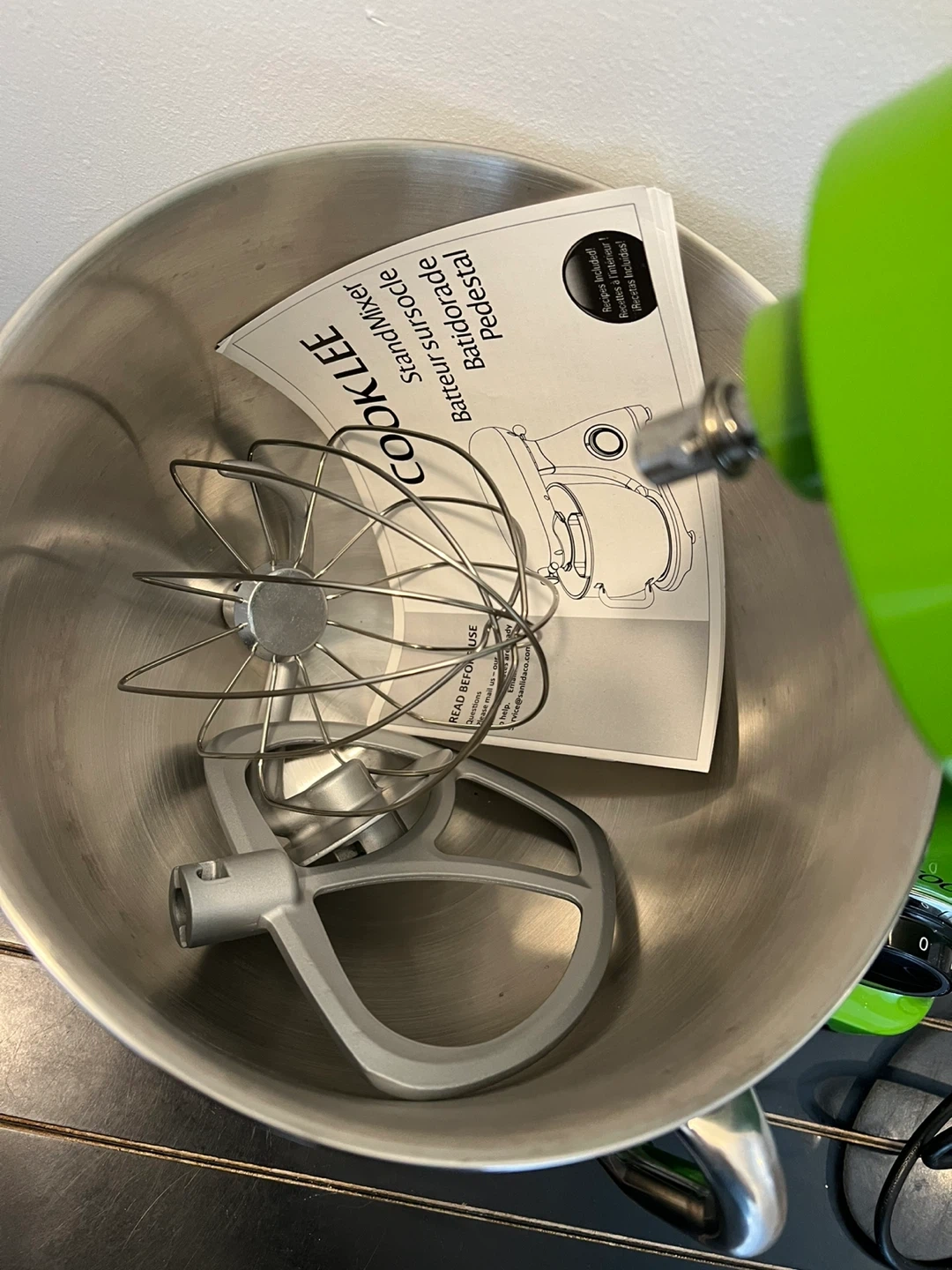 This Cooklee stand mixer comes in a vibrant green colour. It includes a stainless steel bowl, a whisk, and a dough hook. It's perfect for whipping up batters and doughs for baking.