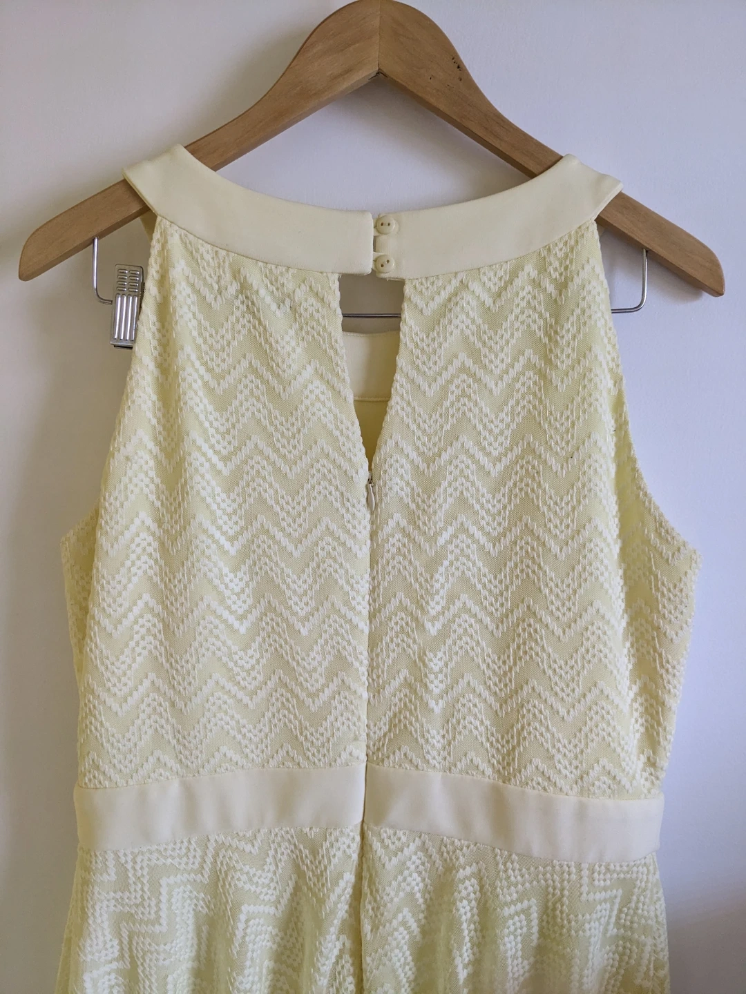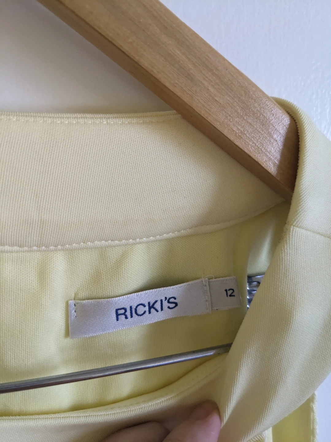 This is a Ricki's sleeveless lace dress in a lovely pale yellow. It has a patterned lace overlay with a smooth lining. The dress features a halter neckline and a fitted waist with a flared skirt. It's a size 12. This dress is perfect for a summer event or a garden party!