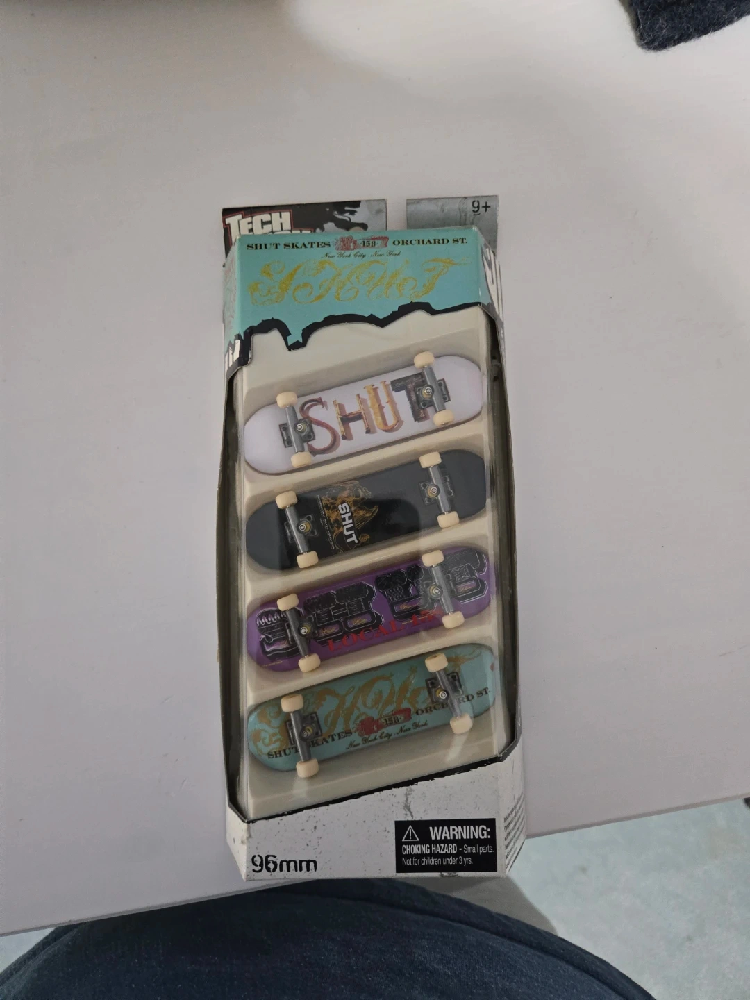 Selling a brand new Vintage Tech Deck SHUT fingerboard 5-pack! These miniature skateboards are perfect for practicing your fingerboarding skills or collecting. The pack includes five different SHUT skateboards, each with unique designs. Warning: contains small parts, not for children under 3 years