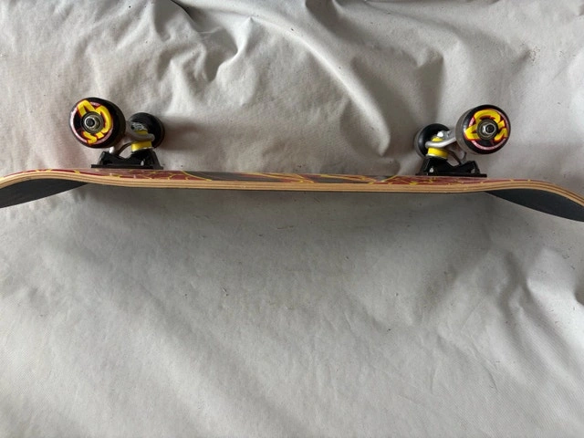 Selling my gently used Santa Cruz Flame Dot complete skateboard. This is a classic setup with the eye-catching red deck featuring a yellow crackle lava pattern and the iconic flame logo in the center. It’s been ridden lightly, so there’s only minor scuffing on the edges and wheels—still rolls smooth and has plenty of life left. Perfect for beginners, street skating, or just cruising around. Specs: Deck: 8.25” width x 31.5” length, 7-ply hard rock maple. Trucks: Bullet 145mm (silver). Wheels: 52mm black urethane. Bearings: ABEC-5. No major damage, grip tape is intact, and it’s ready to ride.