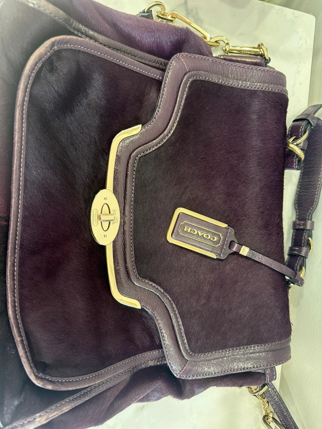 This is a purple Coach handbag. It features a turn-lock closure and a gold-tone chain strap. The bag is made of pony hair and leather.