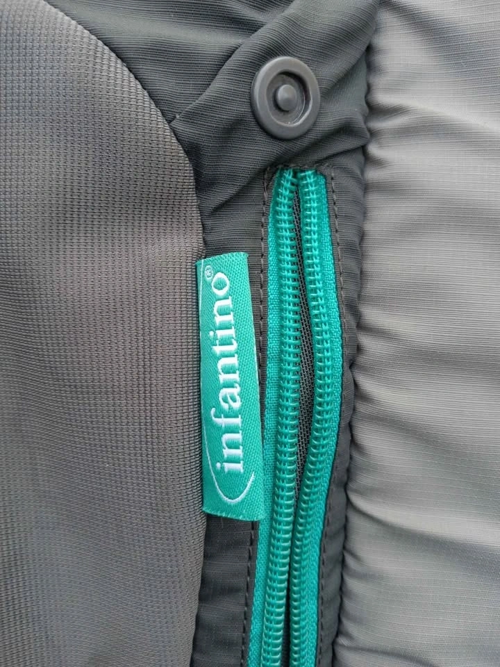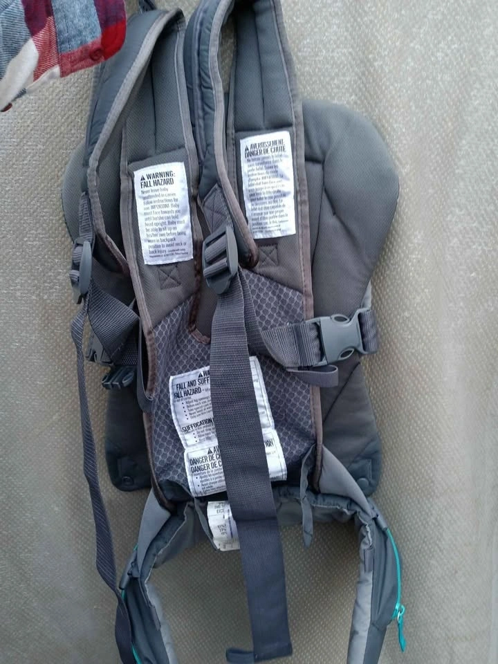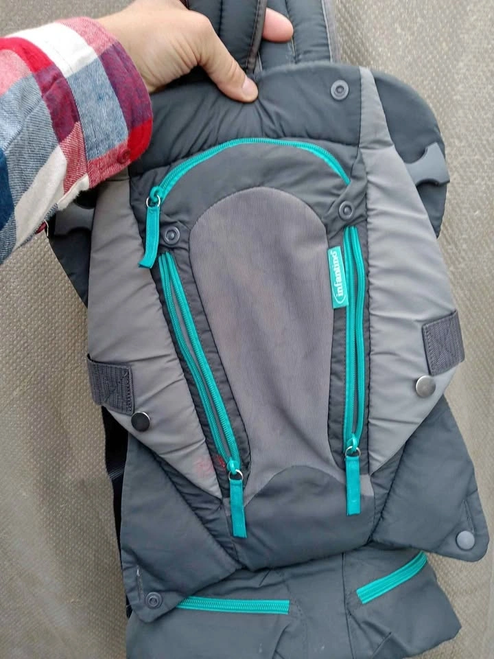 Ergonomic baby carrier in grey with teal accents. Features adjustable padded shoulder straps and a supportive waist belt. Front has multiple zippered pockets for storage. Made from a durable polyester blend with breathable mesh lining.