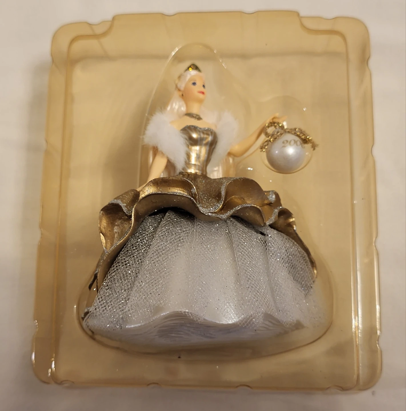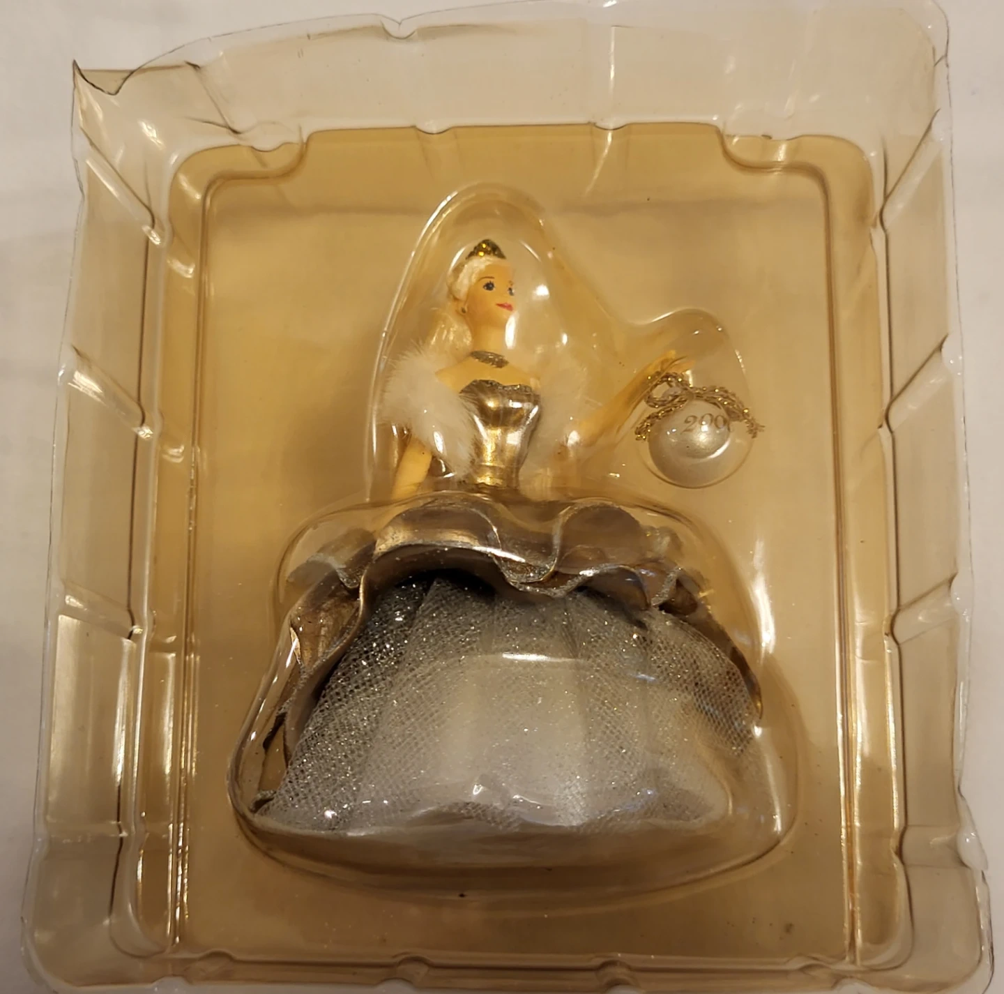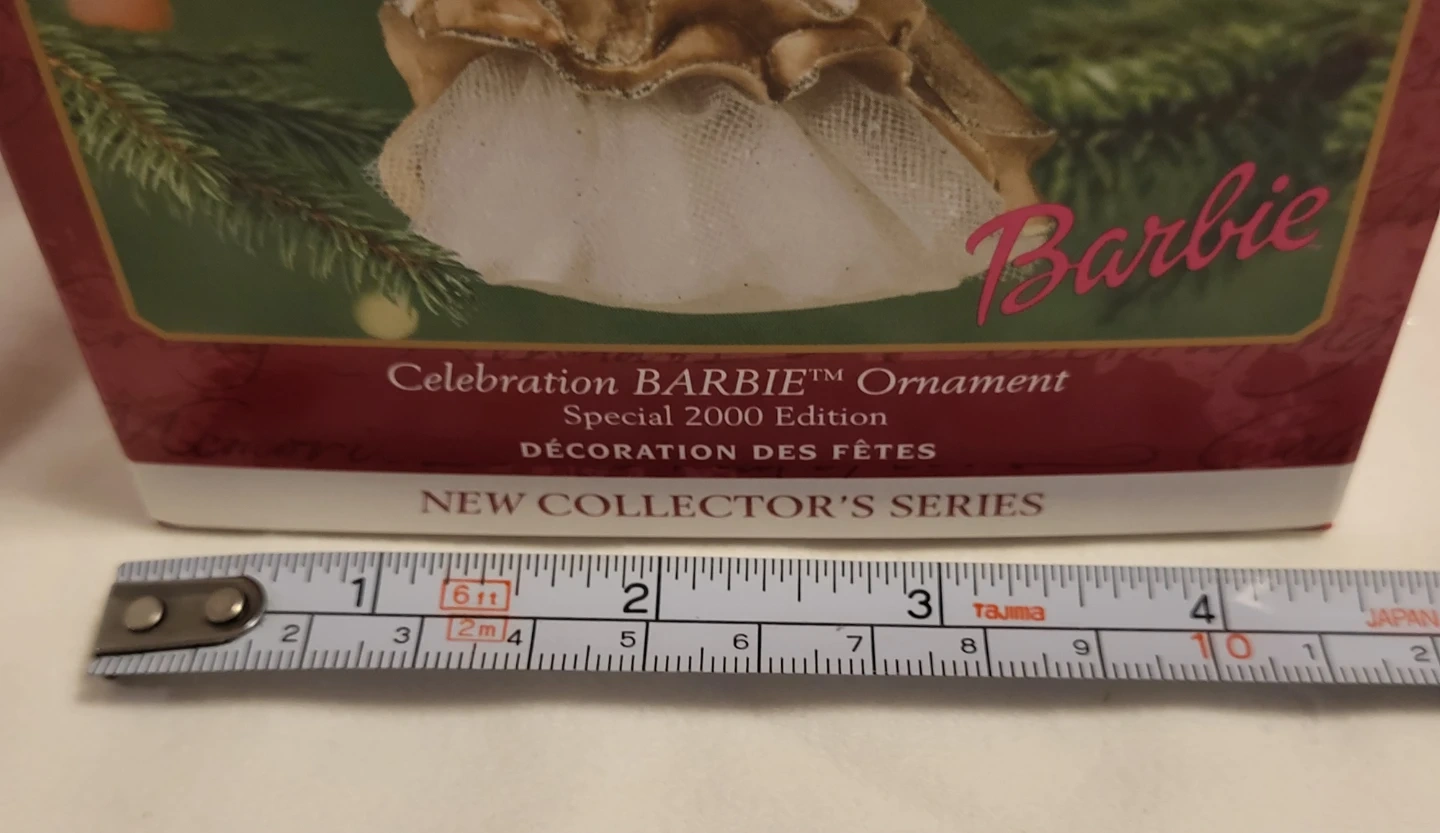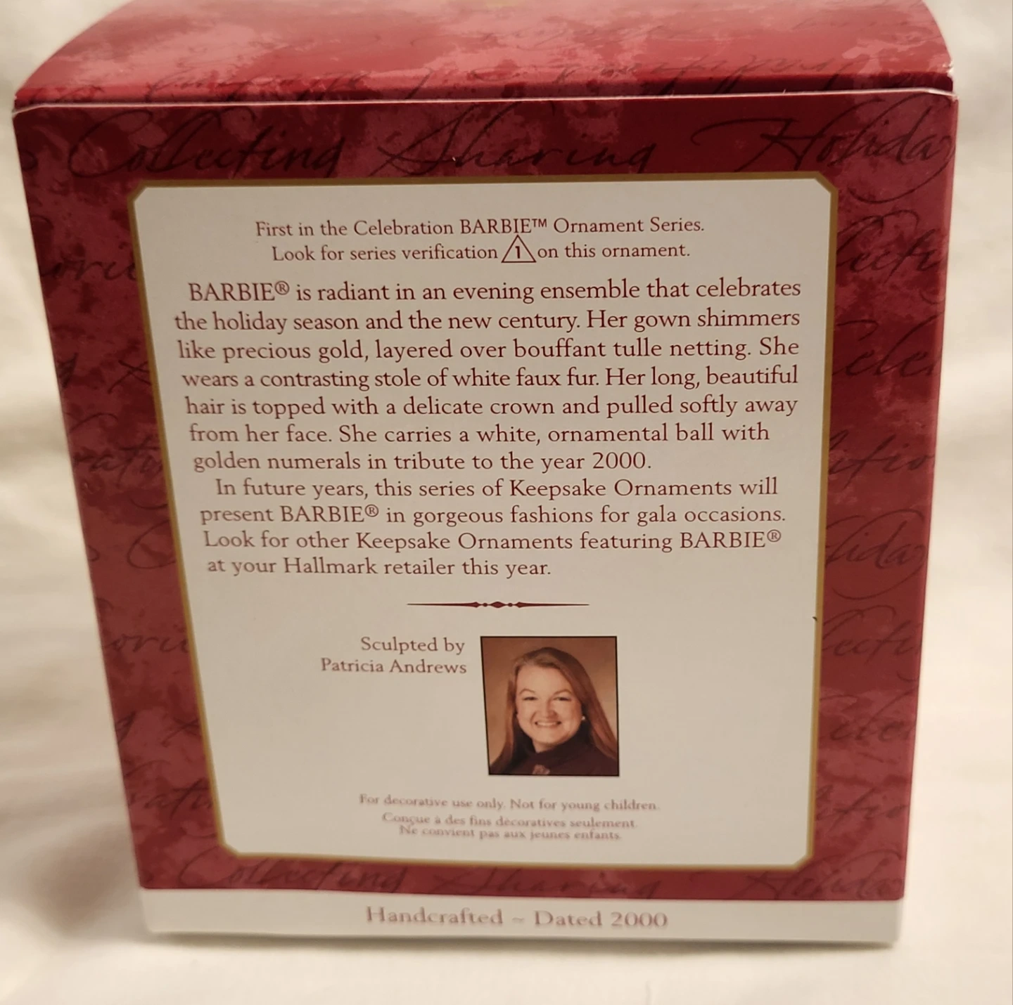 BNIB 2000 Celebration Barbie Ornament. It features Barbie in an evening ensemble with a gown that shimmers. Includes original box. Box only open to take the posted pictures.