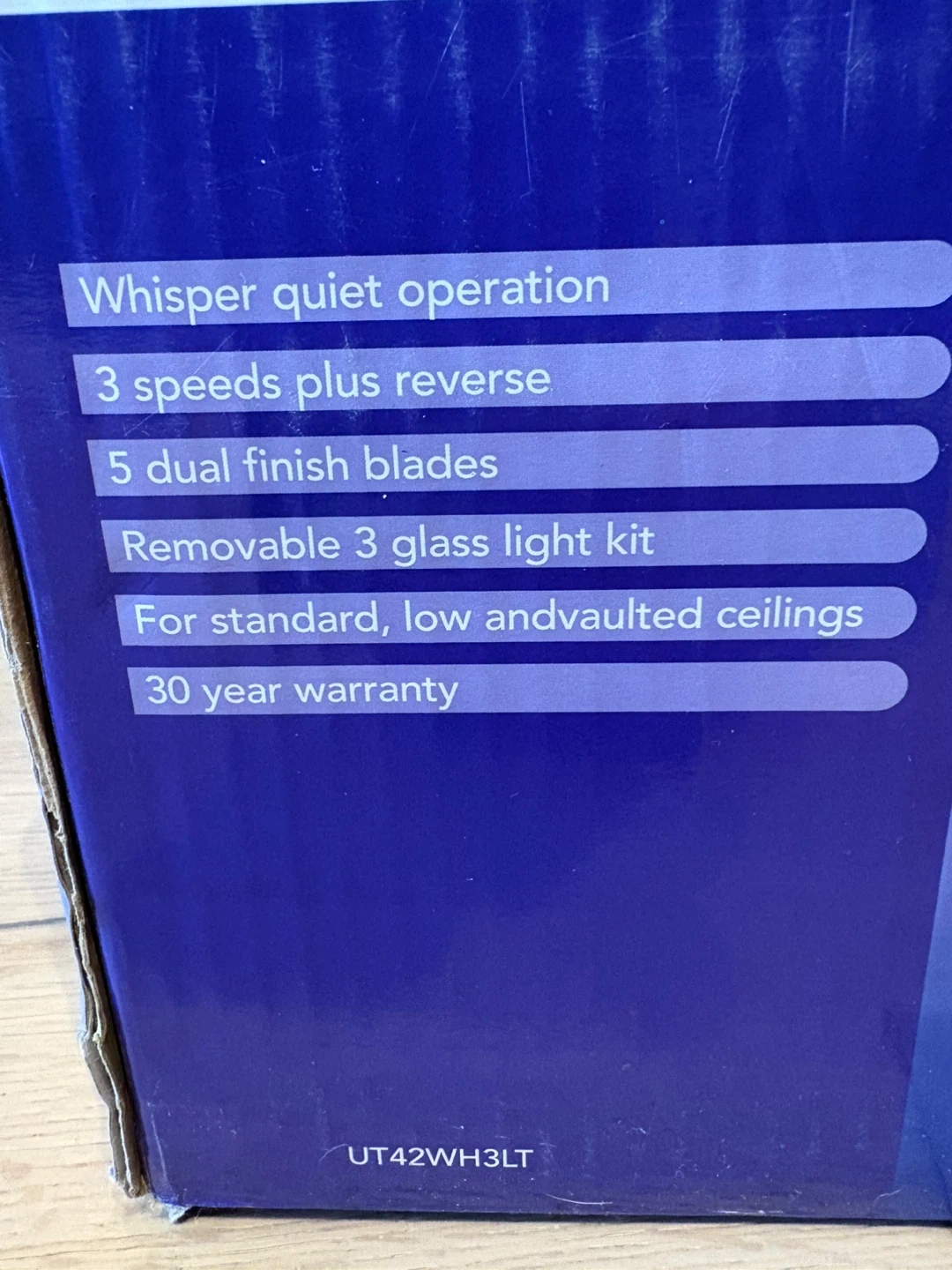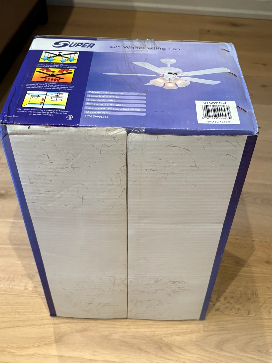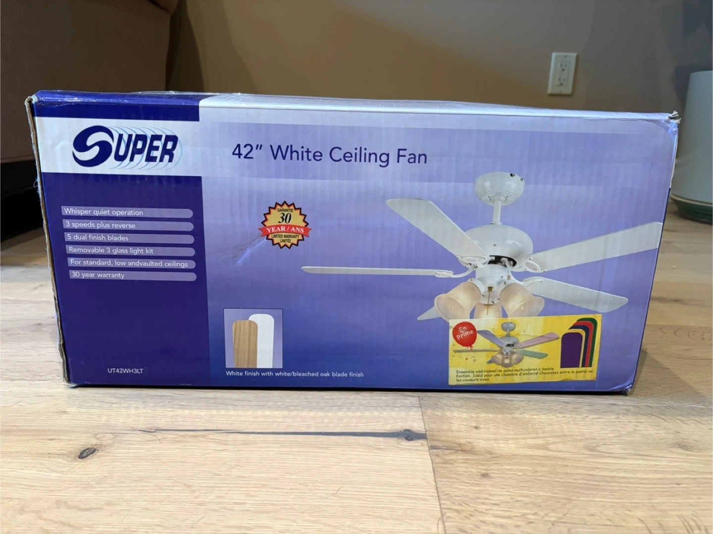 This Super ceiling fan features whisper quiet operation with 3 speeds plus reverse. It has 5 dual finish blades and a removable 3 glass light kit. It's suitable for standard, low and vaulted ceilings and comes with a 30-year warranty. Installation for standard, low and vaulted ceilings.