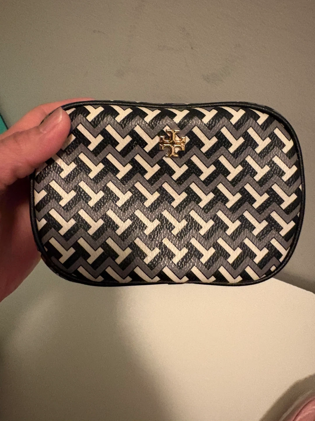 Here's a stylish Tory Burch cosmetic case! It features a unique geometric pattern in black, white, and grey with the iconic Tory Burch logo. Perfect for keeping your makeup and toiletries organized on the go
