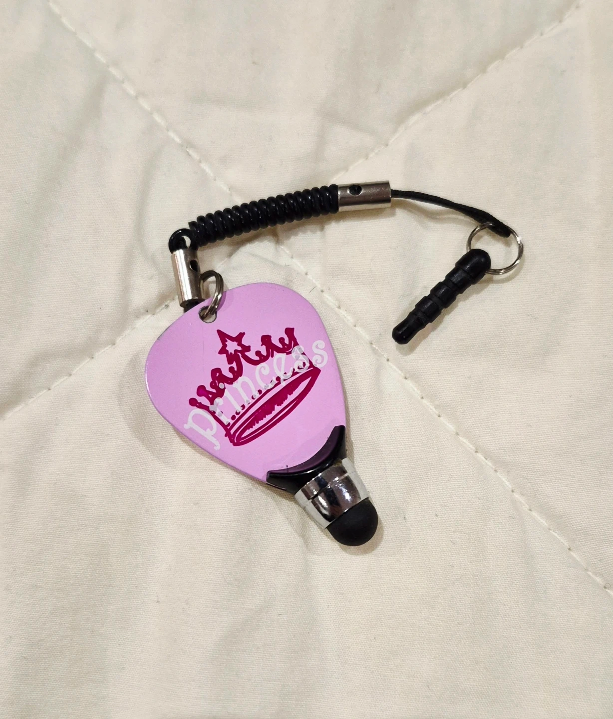 This is a cute guitar-pick style phone charm that also features a rubber stylus tip for cleaning touchscreen. It can only be fitted into a 3.5mm headphone jack.