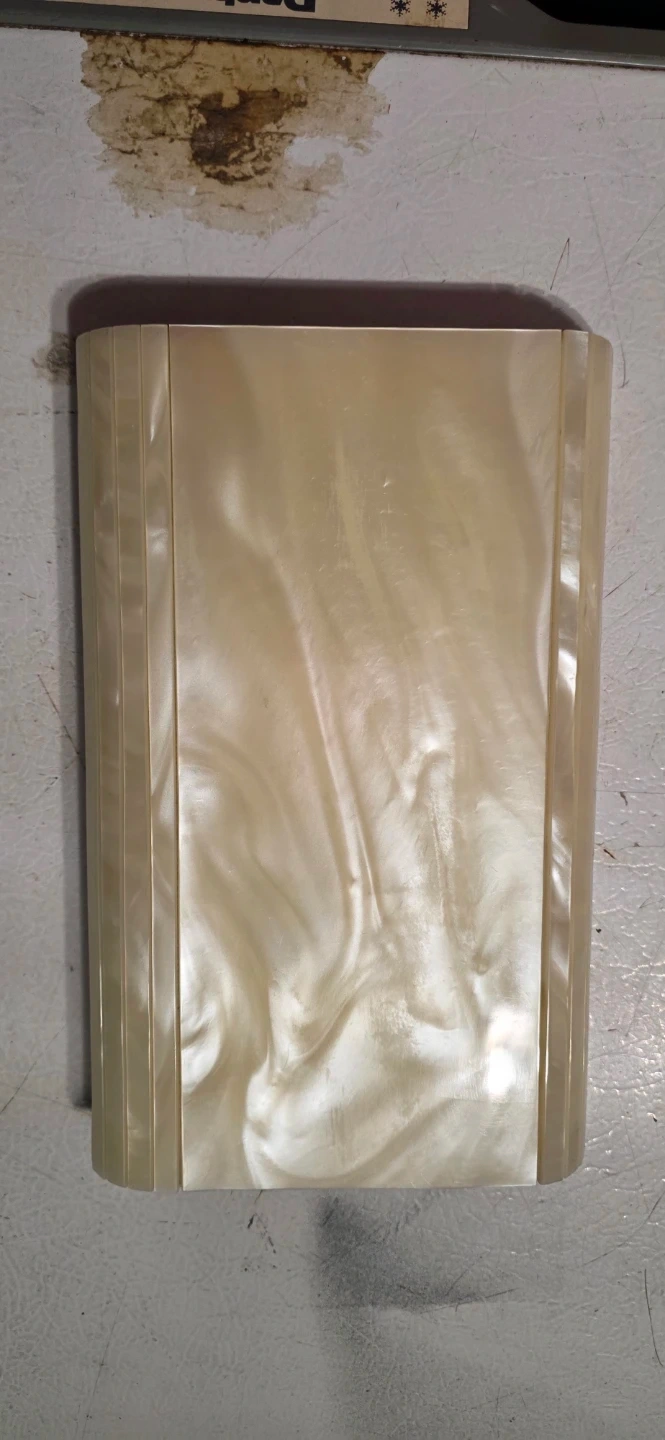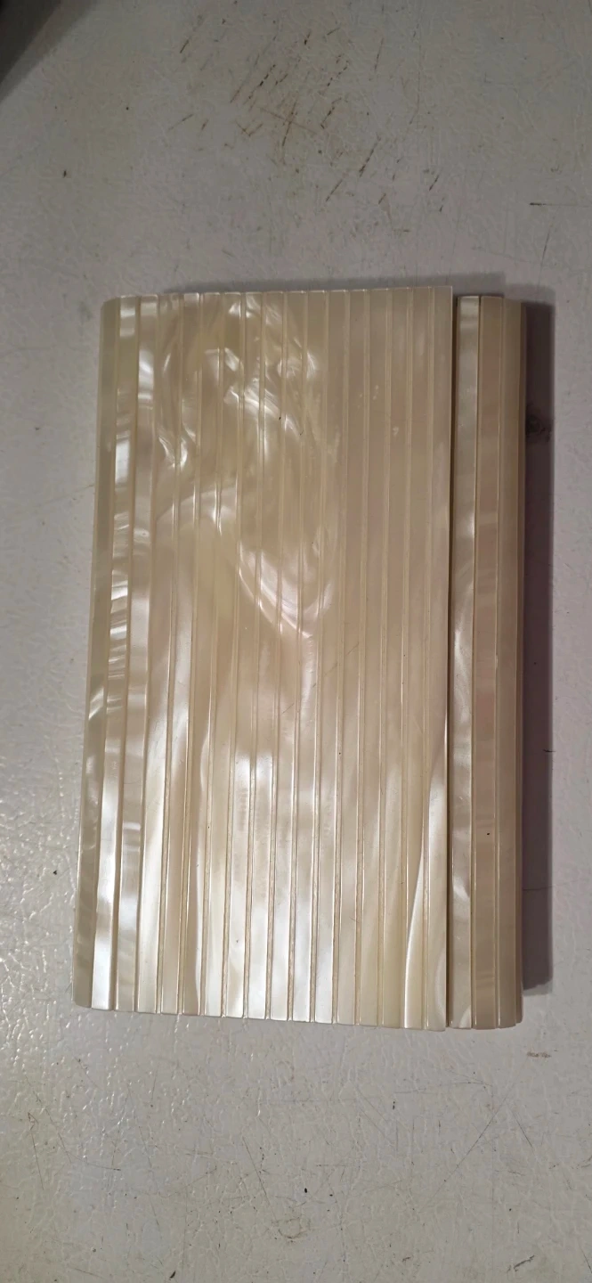 A stylish vintage clutch purse in a cream, swirling pearlescent material. It's a compact size, perfect for carrying essentials. This unique accessory would be great for evening events or adding a touch of retro flair to any outfit!