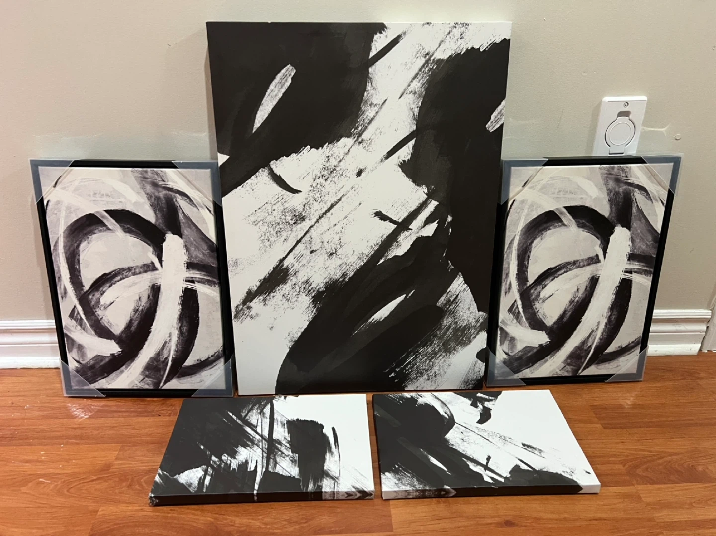 This is a set of five abstract canvas art prints in black and white. It features bold brush strokes and a modern design. Perfect for adding a touch of contemporary style to any room!
