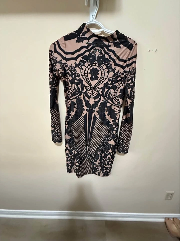 This is a stylish short dress with black and beige sequins. Perfect for a night out or a special occasion. Let me know if you're interested!