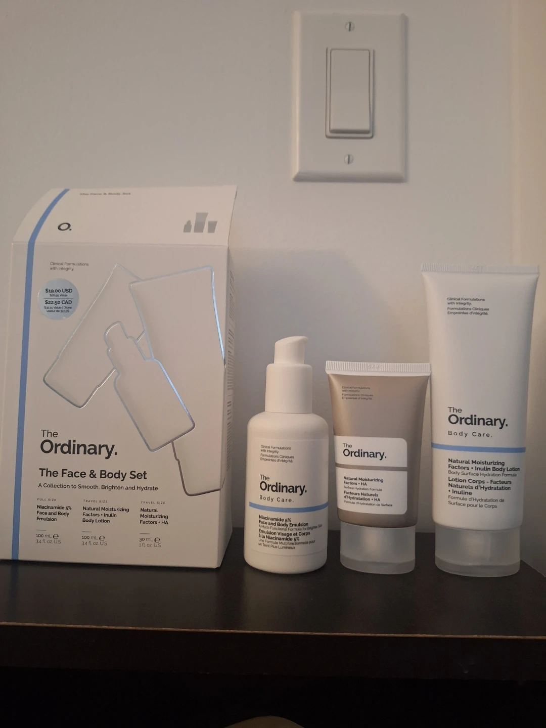 This set includes The Ordinary Niacinamide 5% Face and Body Emulsion (100 mL), Natural Moisturizing Factors + Inulin Body Lotion (100 mL), and Natural Moisturizing Factors + HA (30 mL). These products are formulated to smooth, brighten, and hydrate the skin.