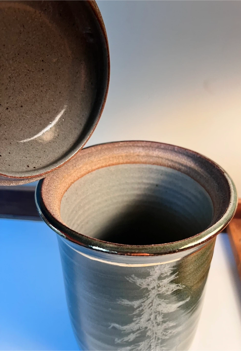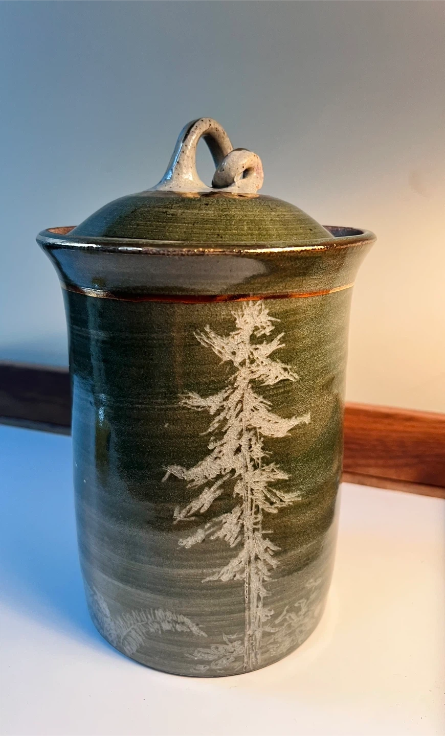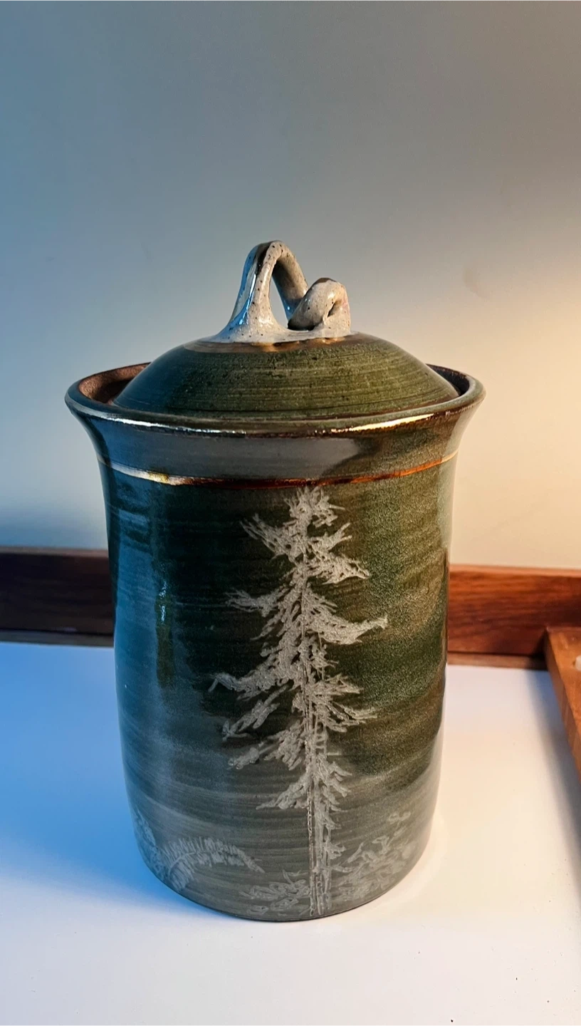 Gorgeous green handmade pottery jar with matching lid and Christmas tree on front.
