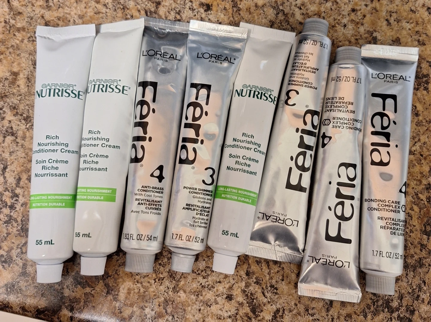 2 Garnier Nutrisse Rich Nourishing Conditioner Creams (55 mL each) and four L'Oréal Féria conditioners.