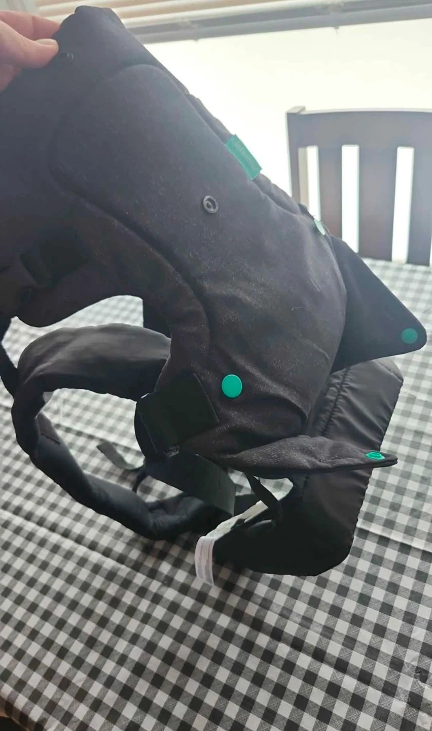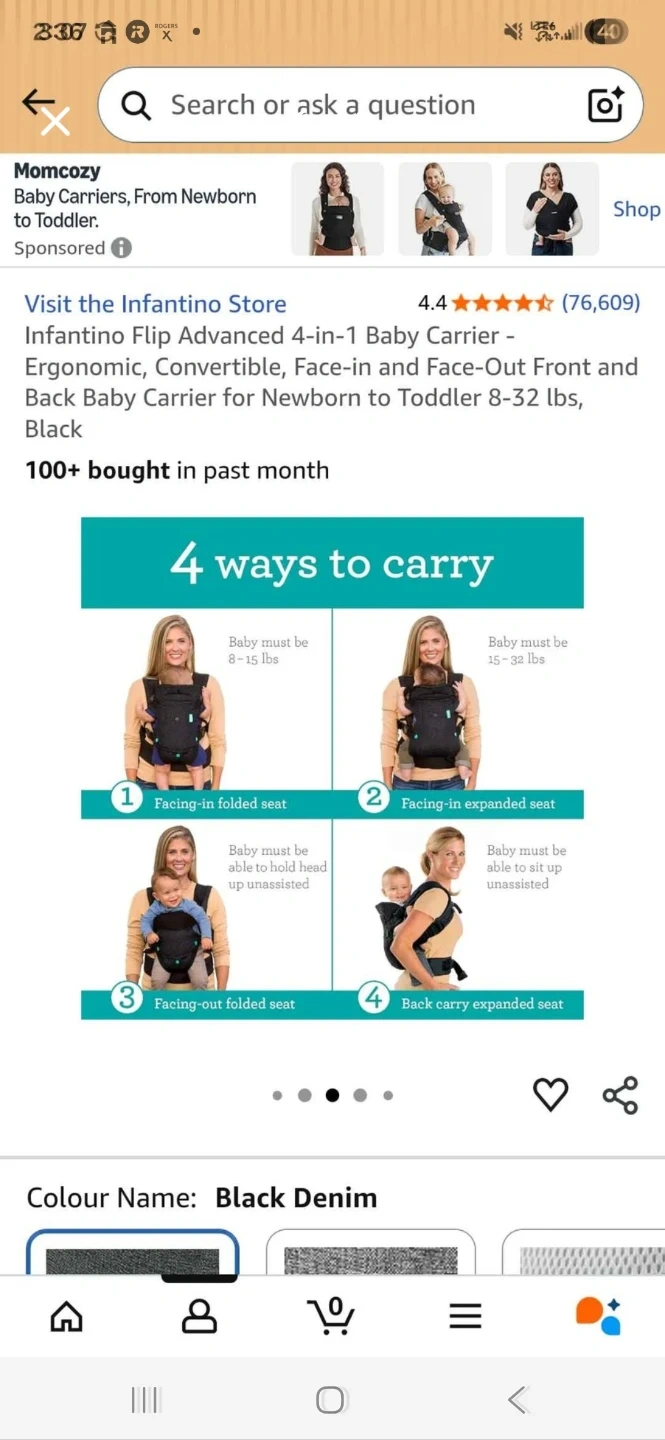 This Infantino Flip Advanced 4-in-1 baby carrier is in black denim. It's designed for newborns to toddlers weighing 8-32 lbs. It offers multiple carrying positions for your convenience!