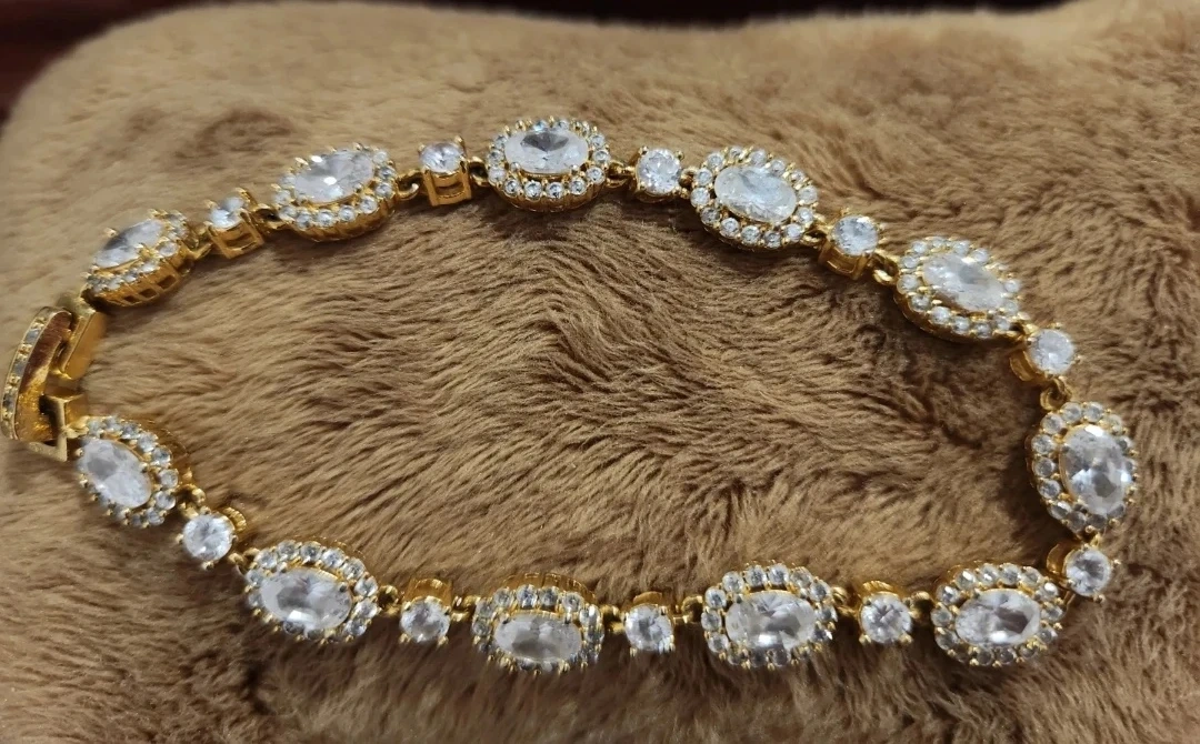 Beautiful gold-tone bracelet featuring multiple clear oval and round stones. It's fastened with a secure clasp. This elegant piece would add sparkle to any outfit!