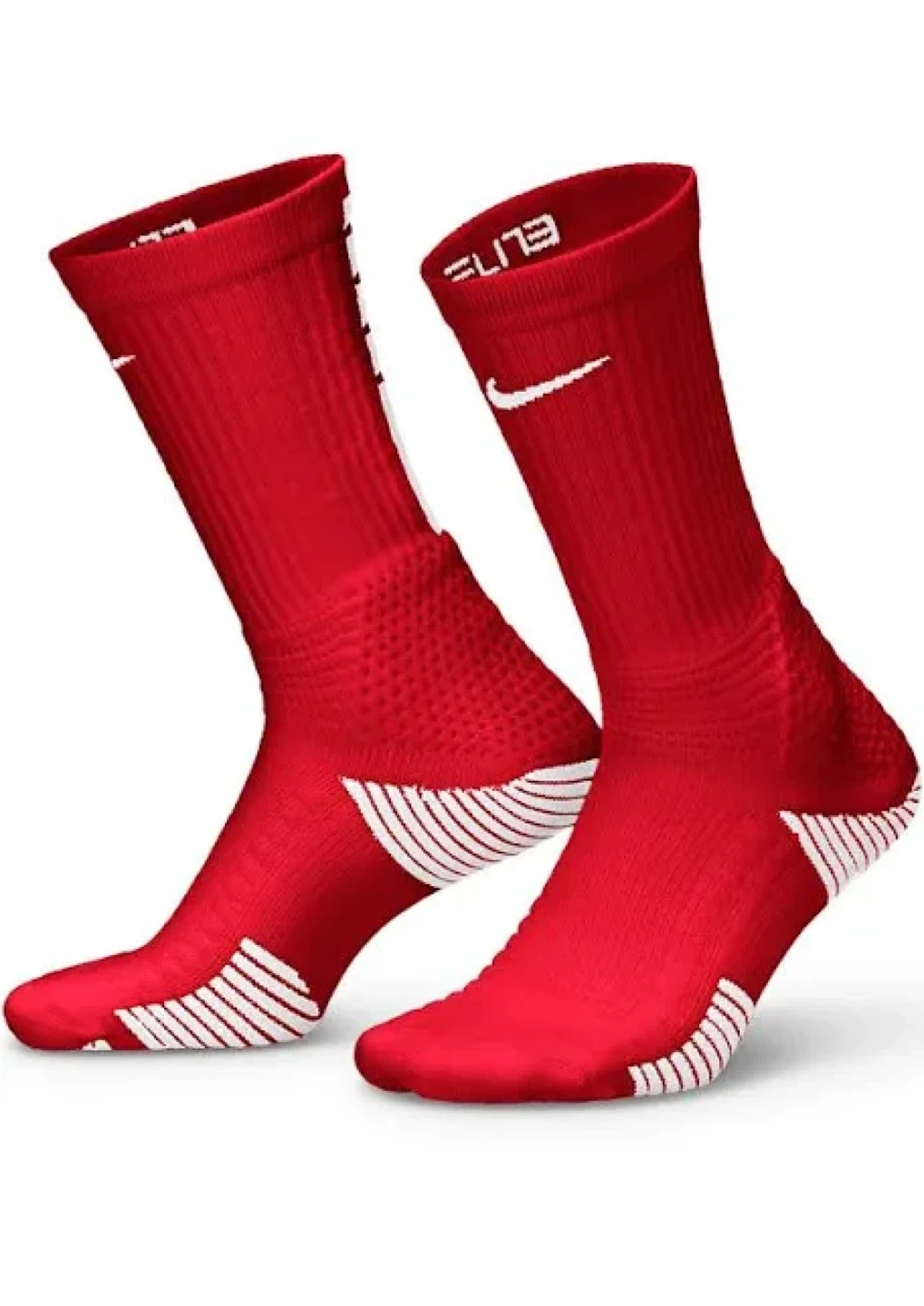 These are red Nike Elite crew socks. They feature the iconic Nike swoosh and 'Elite' branding. Material offers good support and breathability.